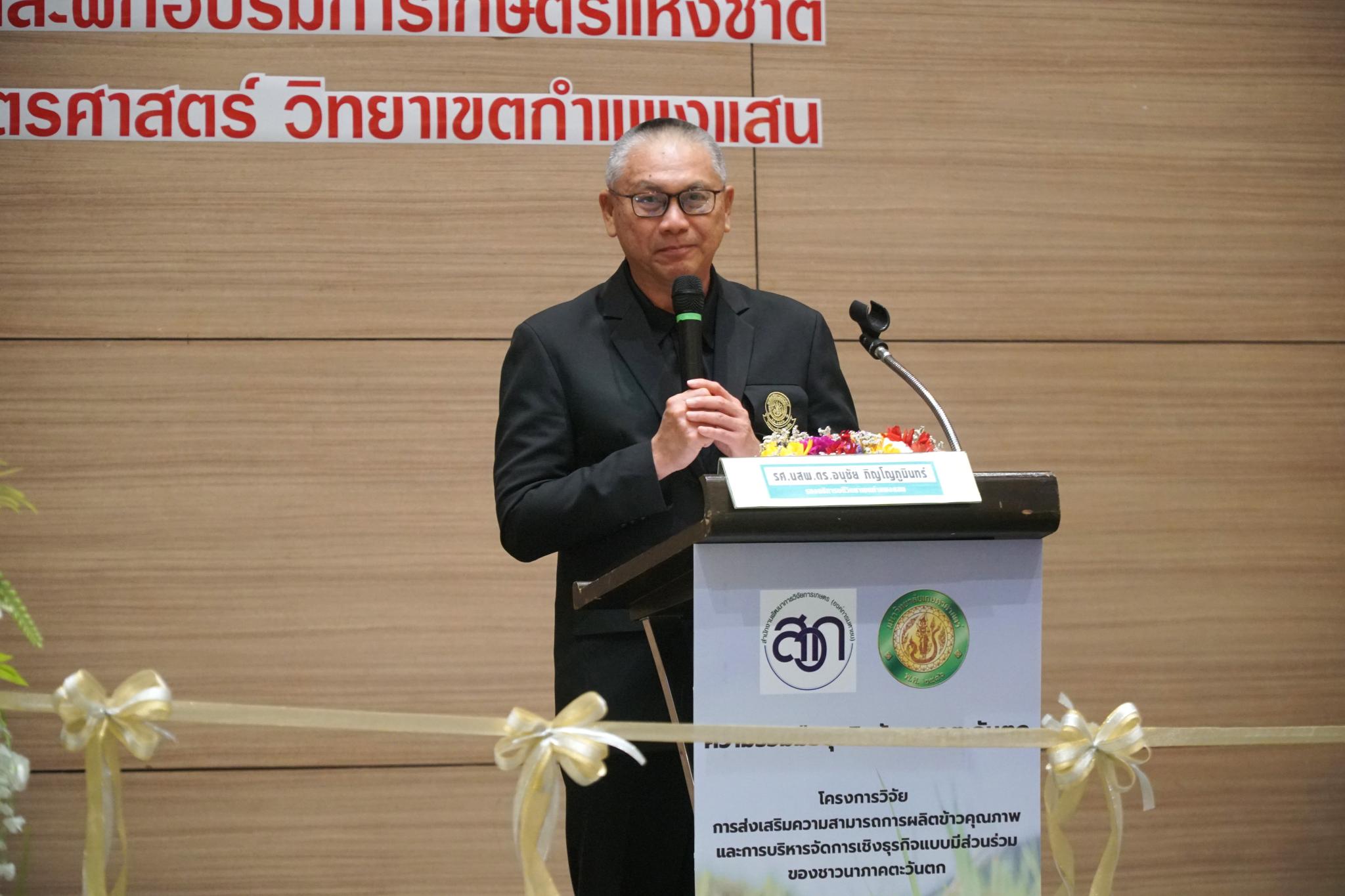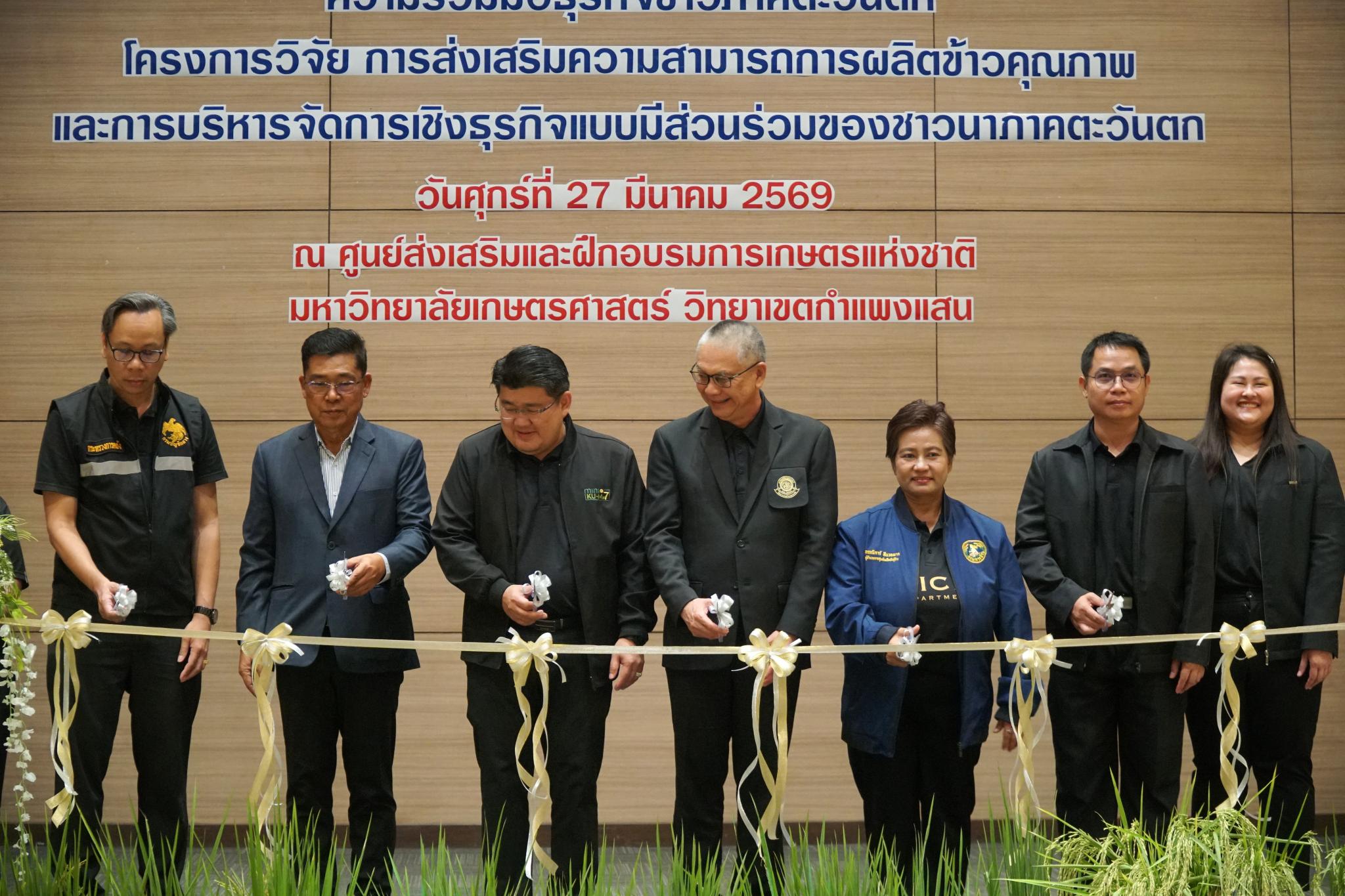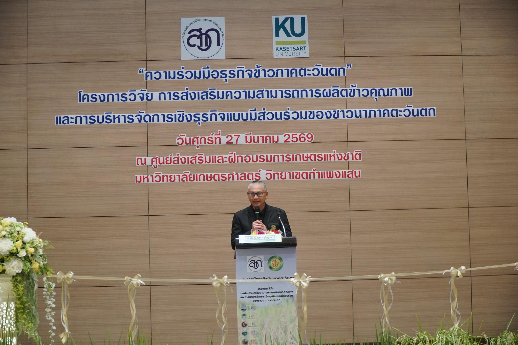 มหาวิทยาลัยเกษตรศาสตร์ วิทยาเขตกำแพงแสน โดย รองศาสตราจารย์ นายสัตวแพทย์ ดร.อนุชัย ภิญโญภูมินทร์ รองอธิการบดีวิทยาเขตกำแพงแสน เป็นประธานในพิธีเปิด กิจกรรมความร่วมมือธุรกิจข้าวภาคตะวันตก ภายใต้โครงการวิจัย “การส่งเสริมความสามารถการผลิตข้าวคุณภาพและการบริหารจัดการเชิงธุรกิจแบบมีส่วนร่วมของชาวนาภาคตะวันตก” ทุนอุดหนุน สกว. เมื่อวันศุกร์ที่ 27 มีนาคม 2569 ณ แสนปาล์มคอนเวนชั่น ฮอลล์ ศูนย์ส่งเสริมและฝึกอบรมการเกษตรแห่งชาติ มหาวิทยาลัยเกษตรศาสตร์ วิทยาเขตกำแพงแสน จังหวัดนครปฐม โดยมี รองศาสตราจารย์ ดร.ธานินทร์ คงศิลา รองอธิการบดีฝ่ายทรัพยากรมนุษย์และยุทธศาสตร์ รักษาการแทนผู้อำนวยการสำนักส่งเสริมและฝึกอบรม กำแพงแสน กล่าวต้อนรับ และ ดร.สาคร ชินวงค์ หัวหน้าโครงการ กล่าวรายงาน