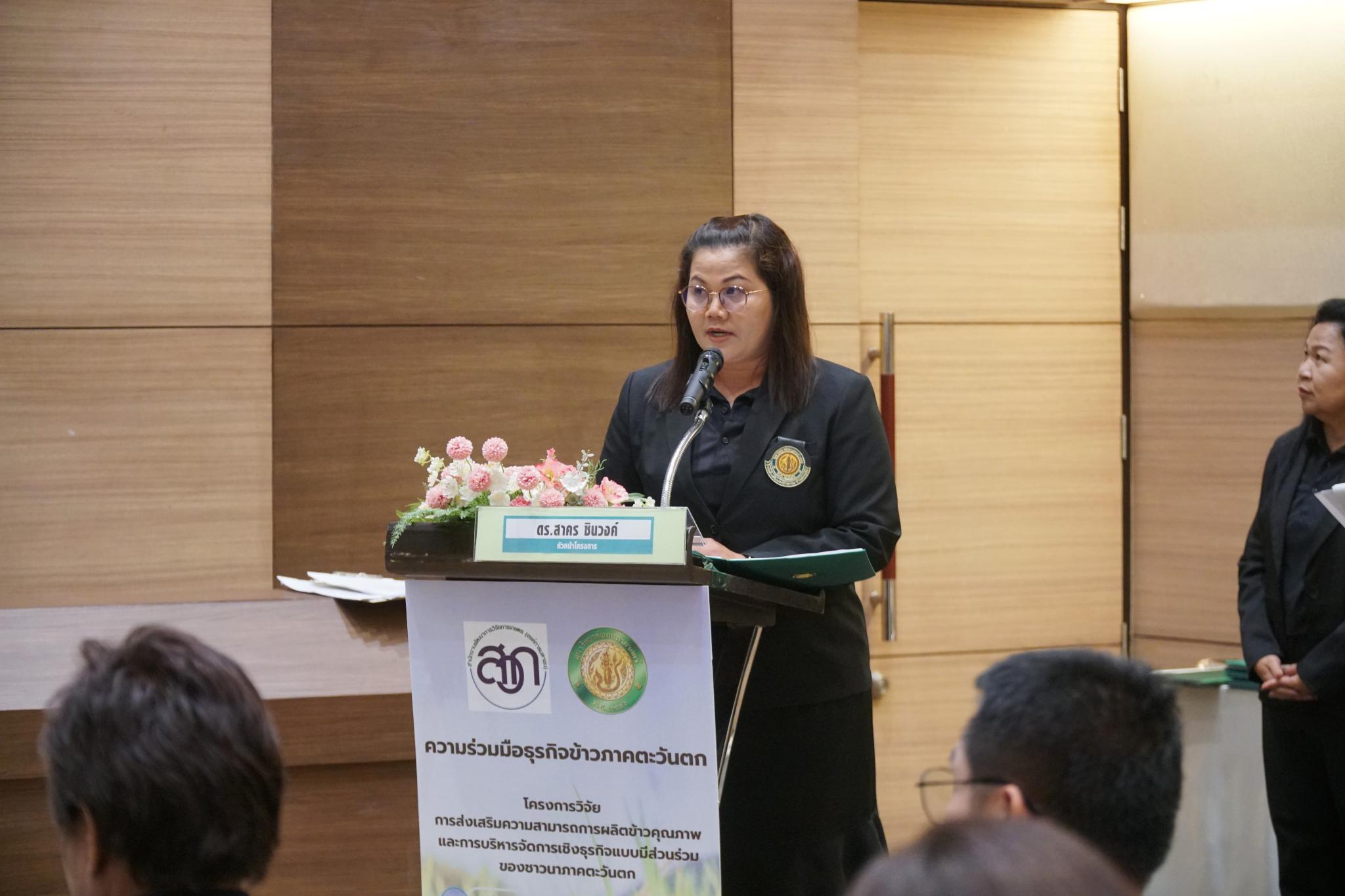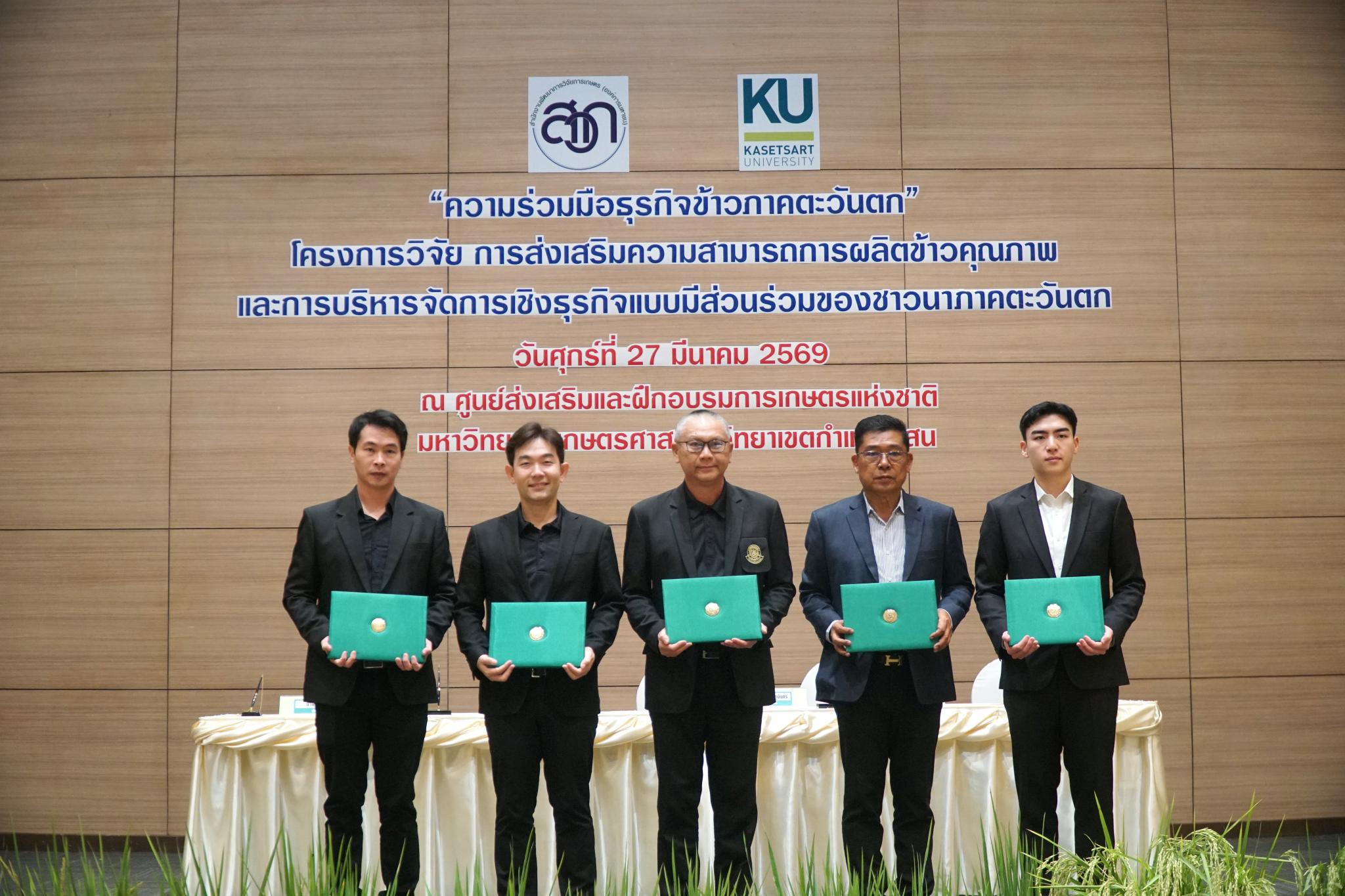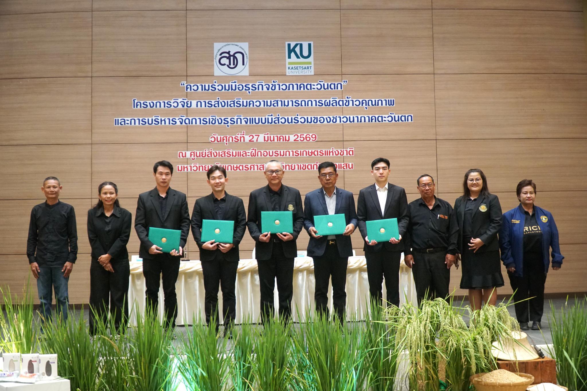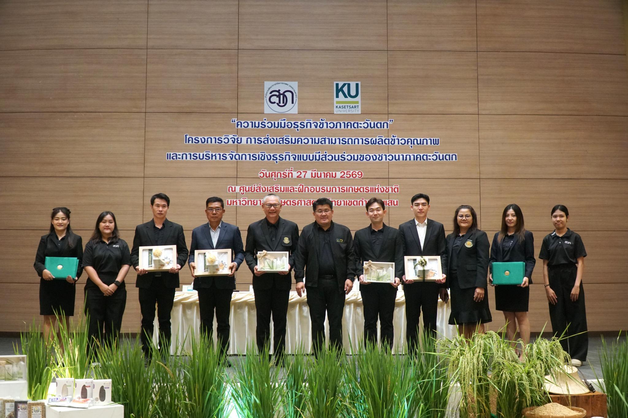 มหาวิทยาลัยเกษตรศาสตร์ วิทยาเขตกำแพงแสน โดย รองศาสตราจารย์ นายสัตวแพทย์ ดร.อนุชัย ภิญโญภูมินทร์ รองอธิการบดีวิทยาเขตกำแพงแสน เป็นประธานในพิธีเปิด กิจกรรมความร่วมมือธุรกิจข้าวภาคตะวันตก ภายใต้โครงการวิจัย “การส่งเสริมความสามารถการผลิตข้าวคุณภาพและการบริหารจัดการเชิงธุรกิจแบบมีส่วนร่วมของชาวนาภาคตะวันตก” ทุนอุดหนุน สกว. เมื่อวันศุกร์ที่ 27 มีนาคม 2569 ณ แสนปาล์มคอนเวนชั่น ฮอลล์ ศูนย์ส่งเสริมและฝึกอบรมการเกษตรแห่งชาติ มหาวิทยาลัยเกษตรศาสตร์ วิทยาเขตกำแพงแสน จังหวัดนครปฐม โดยมี รองศาสตราจารย์ ดร.ธานินทร์ คงศิลา รองอธิการบดีฝ่ายทรัพยากรมนุษย์และยุทธศาสตร์ รักษาการแทนผู้อำนวยการสำนักส่งเสริมและฝึกอบรม กำแพงแสน กล่าวต้อนรับ และ ดร.สาคร ชินวงค์ หัวหน้าโครงการ กล่าวรายงาน