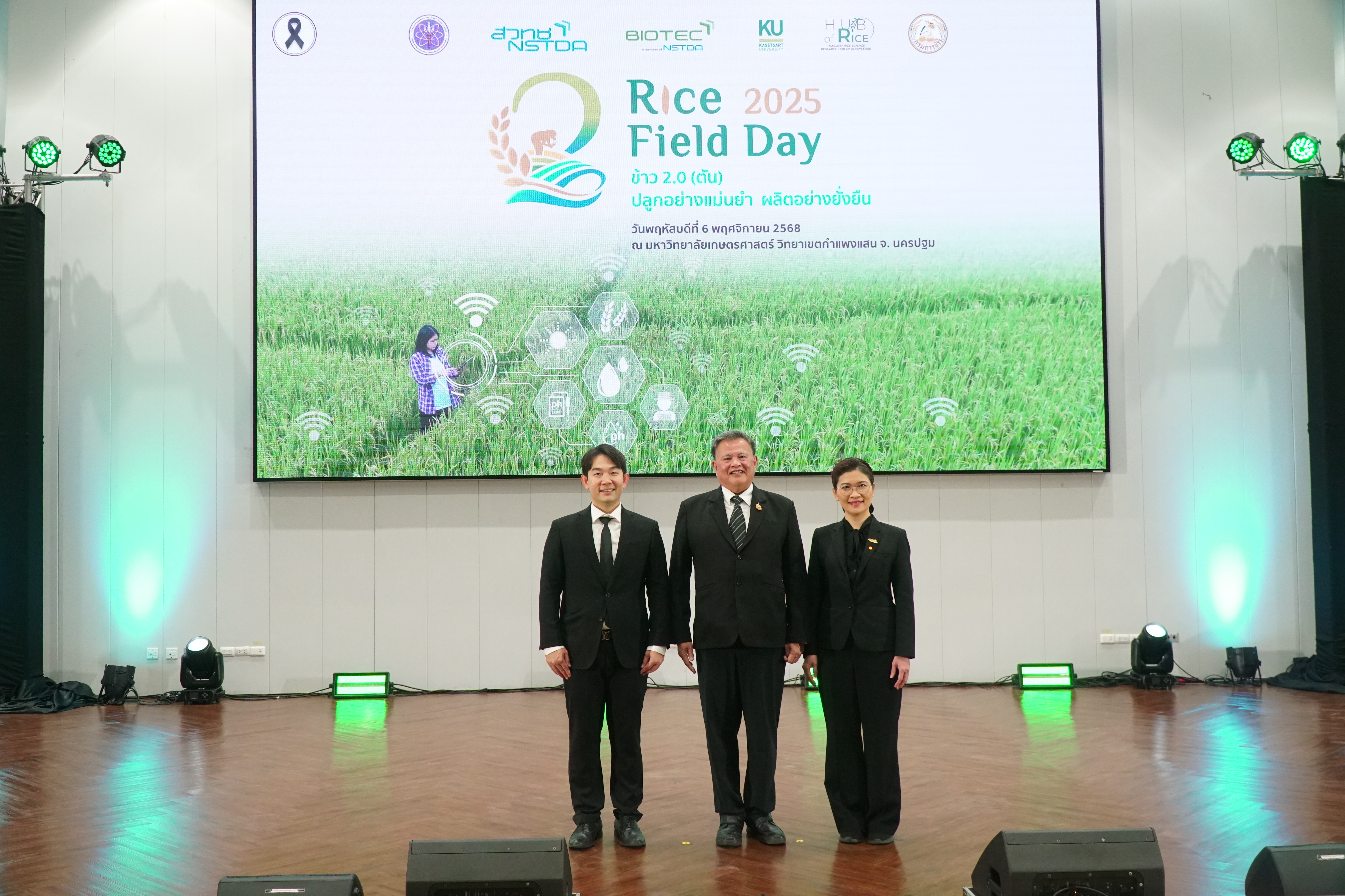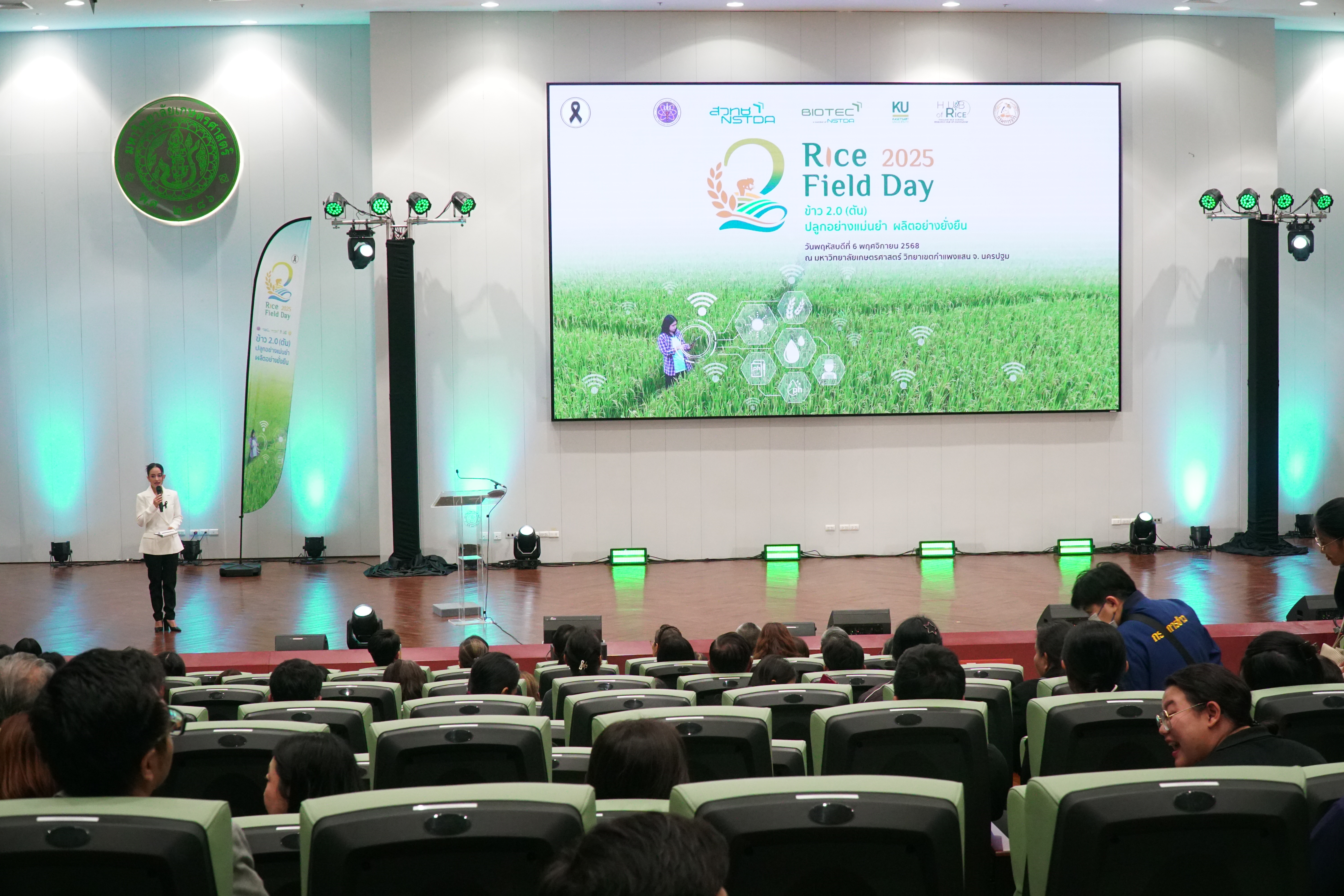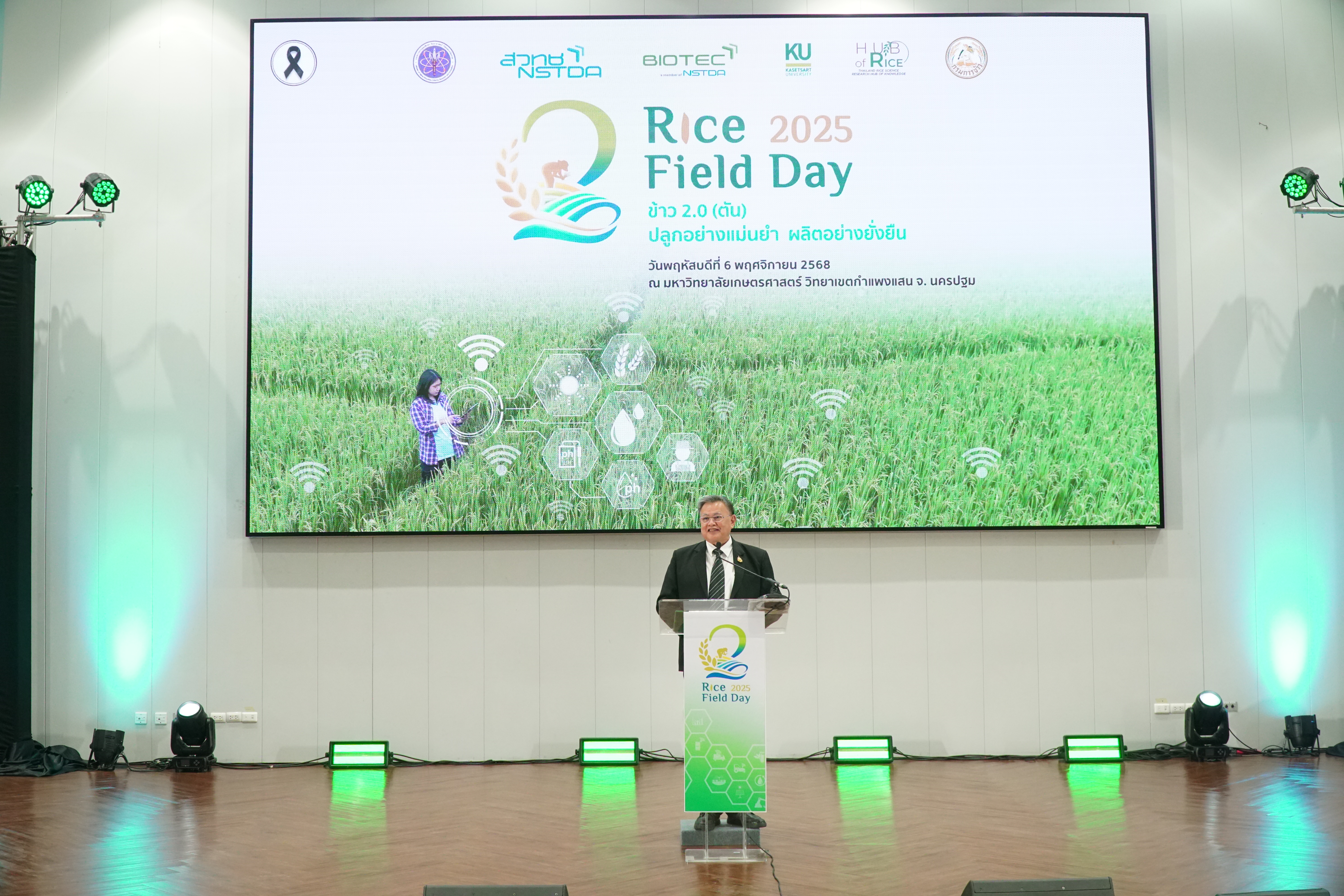 ดร.ดำรงค์ ศรีพระราม รักษาการแทนอธิการบดีมหาวิทยาลัยเกษตรศาสตร์ เป็นประธานเปิดงานจัดแสดงพันธุ์ข้าว "NSTDA-KU Rice Field Day 2025" ข้าว 2.0 (ตัน) ปลูกอย่างแม่นยำ ผลิตอย่างยั่งยืน เมื่อวันพฤหัสบดีที่ 6 พฤศจิกายน 2568 ณ มหาวิทยาลัยเกษตรศาสตร์ วิทยาเขตกำแพงแสน โดย รองศาสตราจารย์ ดร. ศิวเรศ อารีกิจ ผู้อำนวยการศูนย์วิทยาศาสตร์ข้าว เป็นผู้กล่าวต้อนรับ และ ผู้ช่วยศาสตราจารย์ ดร. เชาวรีย์ อรรถลังเป็นผู้กล่าวรายงานวัตถุประสงค์การจัดงาน ซึ่งการจัดงานในครั้งนี้เกิดจากความร่วมมือกันระหว่างศูนย์วิทยาศาสตร์ข้าว มหาวิทยาลัยเกษตรศาสตร์ ศูนย์พันธุวิศวกรรมและเทคโนโลยีชีวภาพแห่งชาติ สำนักงานพัฒนาวิทยาศาสตร์และเทคโนโลยีแห่งชาติ (สวทช.) กรมการข้าว และภาคีเครือข่ายศูนย์กลางความรู้ด้านวิทยาศาสตร์และการวิจัยข้าวของประเทศไทย (Hub of Rice) โดยมีวัตถุประสงค์หลัก เพื่อเป็นการแสดงศักยภาพด้านเทคโนโลยีและนวัตกรรมการปรับปรุงพันธุ์ข้าวที่มุ่งเน้นผลผลิตสูง 1.5 – 2 ตันต่อไร่ อายุการเก็บเกี่ยวสั้น 90 – 100 วัน รวมถึงพันธุ์ข้าวพร้อมใช้ที่รองรับกับสภาพแวดล้อมวิกฤตและการใช้ปัจจัยการผลิตอย่างมีประสิทธิภาพ เป็นมิตรต่อสิ่งแวดล้อม การจัดงานในครั้งนี้ได้รับความสนใจจากนิสิต นักศึกษา นักวิจัย นักวิชาการ คณาจารย์ บุคลากรของมหาวิทยาลัยและองค์กรที่เกี่ยวข้องกับการวิจัย ผู้ประกอบการกลุ่มธุรกิจ การสีข้าวและส่งออกข้าว เกษตรกร เครือข่ายเกษตรกร ประชาชน และผู้สนใจทั่วไป เข้าร่วมงานเป็นจำนวนมาก
