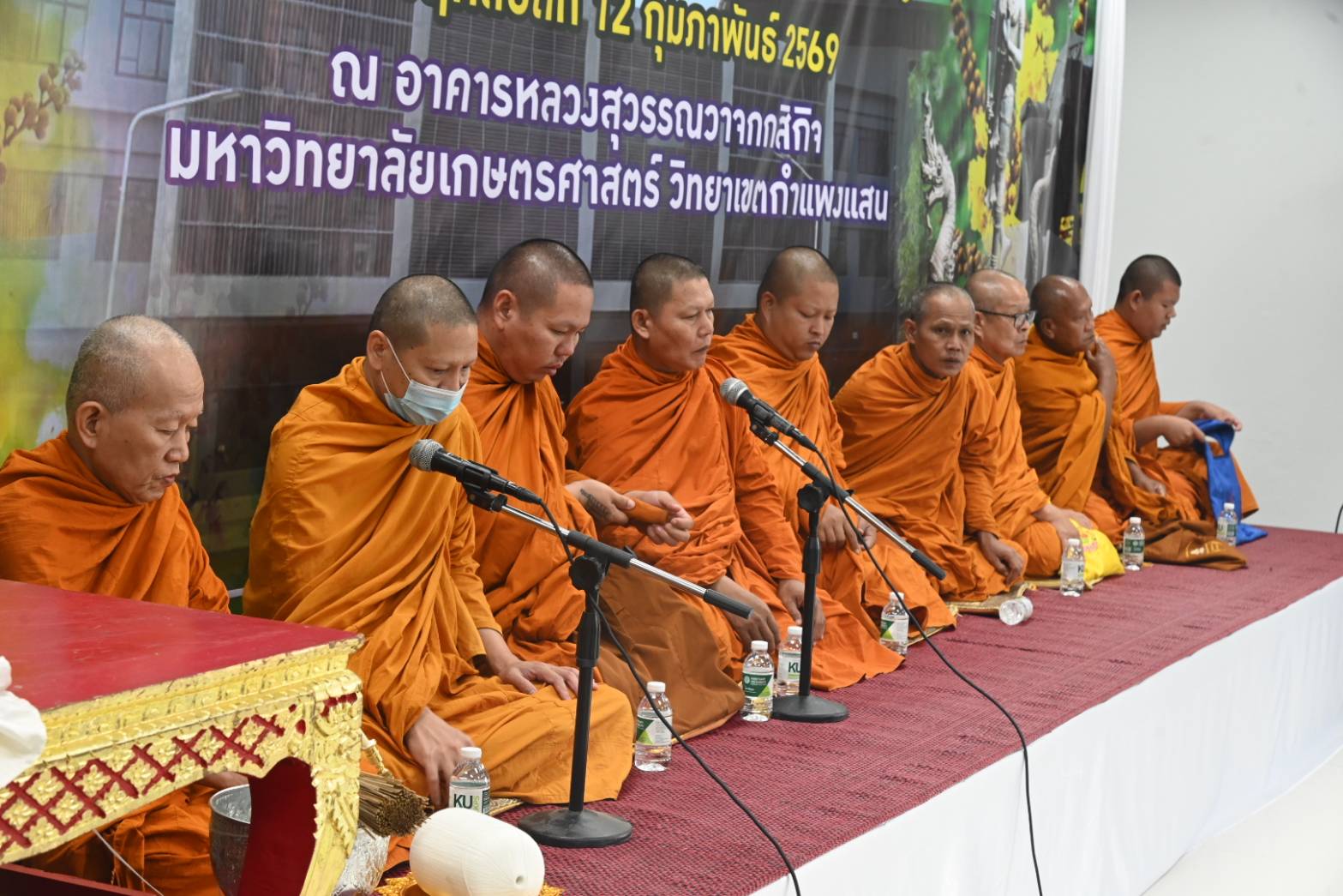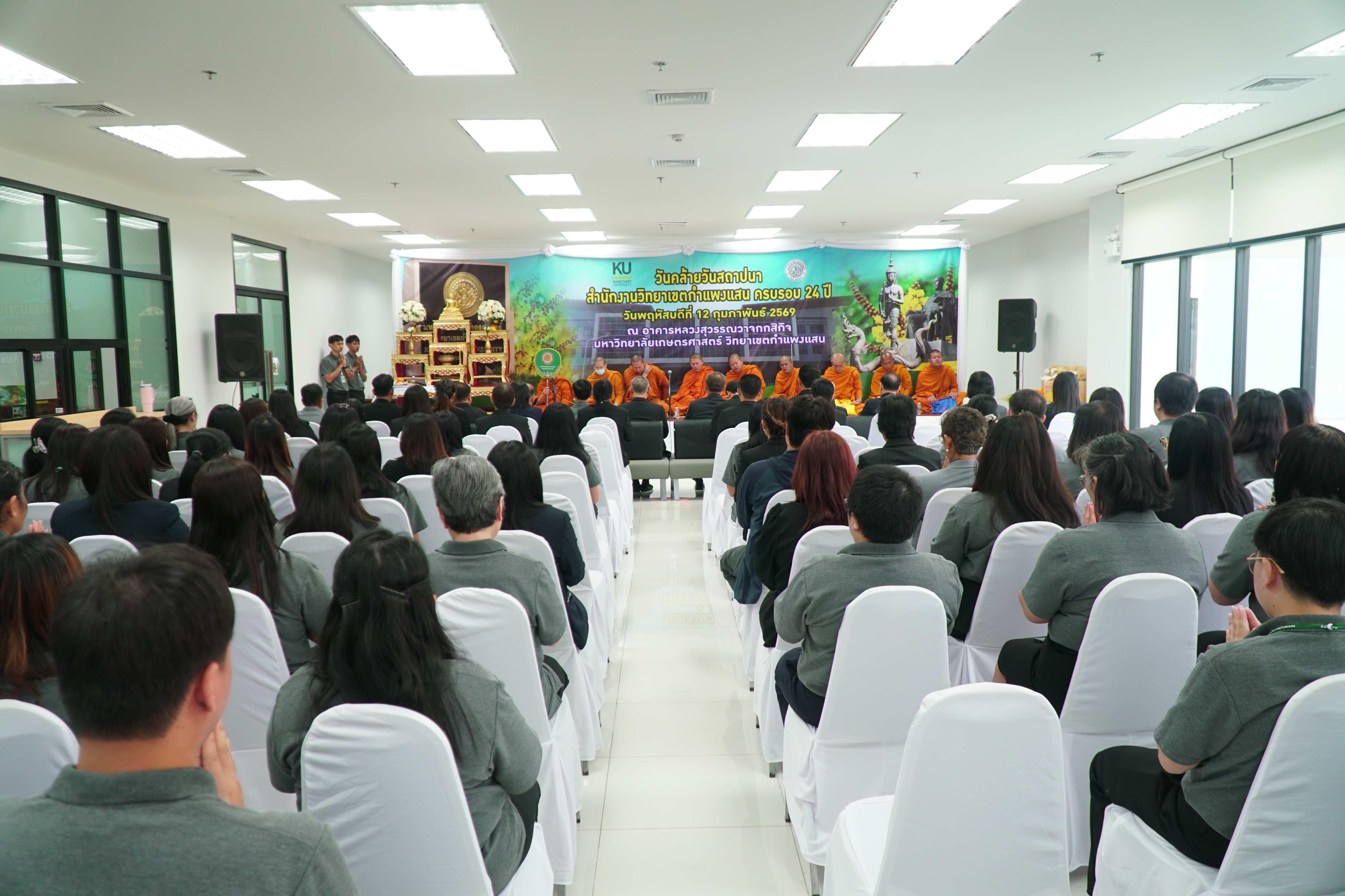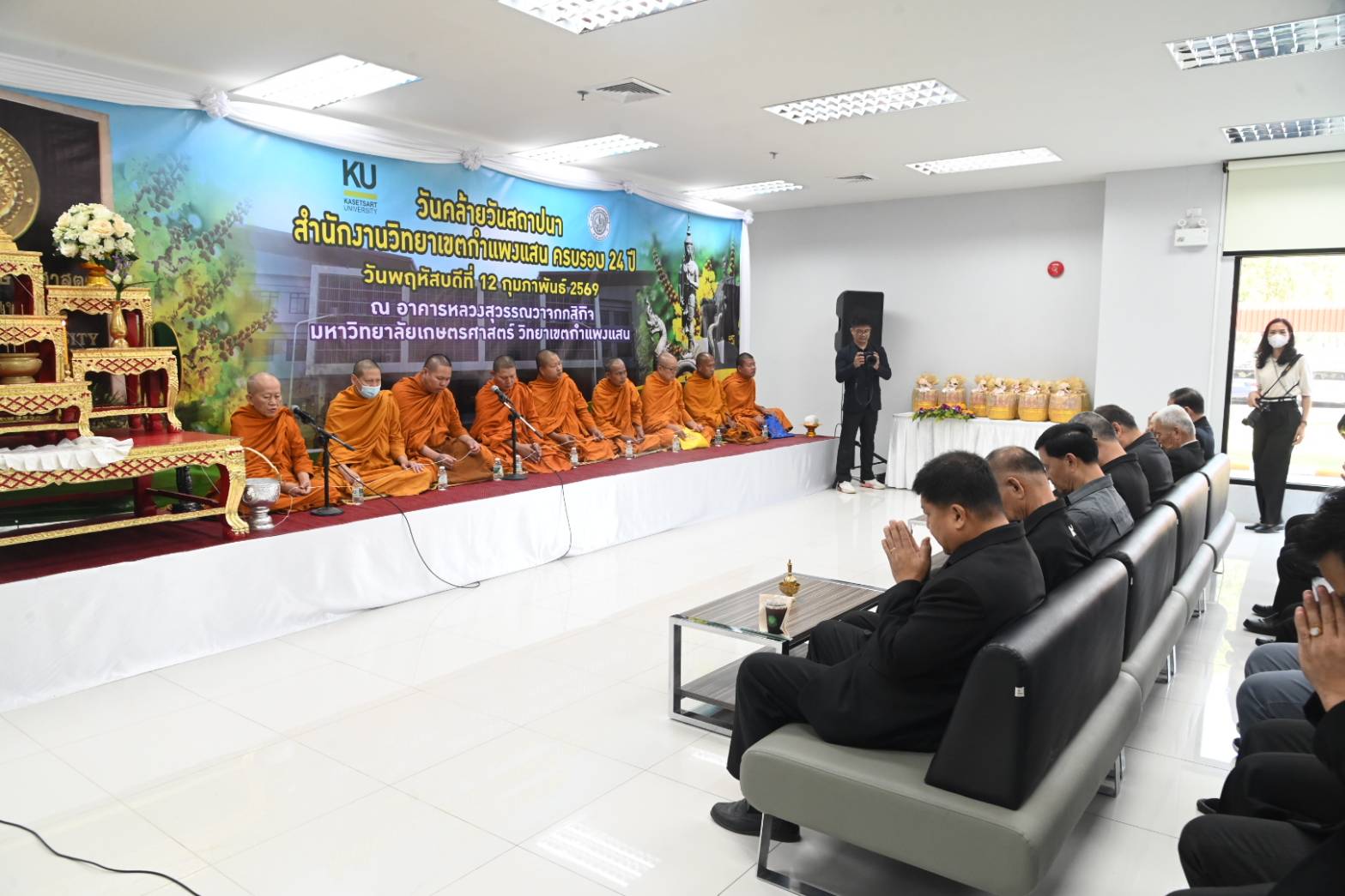 รองศาสตราจารย์ นายสัตวแพทย์ ดร.อนุชัย ภิญโญภูมิมินทร์ รองอธิการบดี วิทยาเขตกำแพงแสน พร้อมด้วยคณะผู้บริหาร ร่วมแสดงความยินดีเนื่องในโอกาส วันคล้ายวันสถาปนา สำนักงานวิทยาเขตกำแพงแสน ครบรอบ 24 ปี และมอบใบประกาศเกียรติคุณแด่บุคลากรดีเด่น ประจำปี 2569 เมื่อวันพฤหัสบดีที่ 12 กุมภาพันธ์ 2569 โดยมี นายอุกฤษฏ์ มนูจันทรัถ ผู้อำนวยการสำนักงานวิทยาเขตกำแพงแสน และคณะผู้บริหารสำนักงานวิทยาเขตกำแพงแสน ให้การต้อนรับ กิจกรรมประกอบไปด้วย พระสงฆ์เจริญพระพุทธมนต์ ถวายภัตตาหารเพลแด่พระสงฆ์ จำนวน 9 รูป พิธีมอบใบประกาศเกียรติคุณแด่บุคลากรดีเด่น สำนักงานวิทยาเขตกำแพงแสน ประจำปี 2569 และรับประทานอาหารกลางวันร่วมกัน ณ อาคารหลวงสุวรรณวาจกกสิกิจ มหาวิทยาลัยเกษตรศาสตร์ วิทยาเขตกำแพงแสน