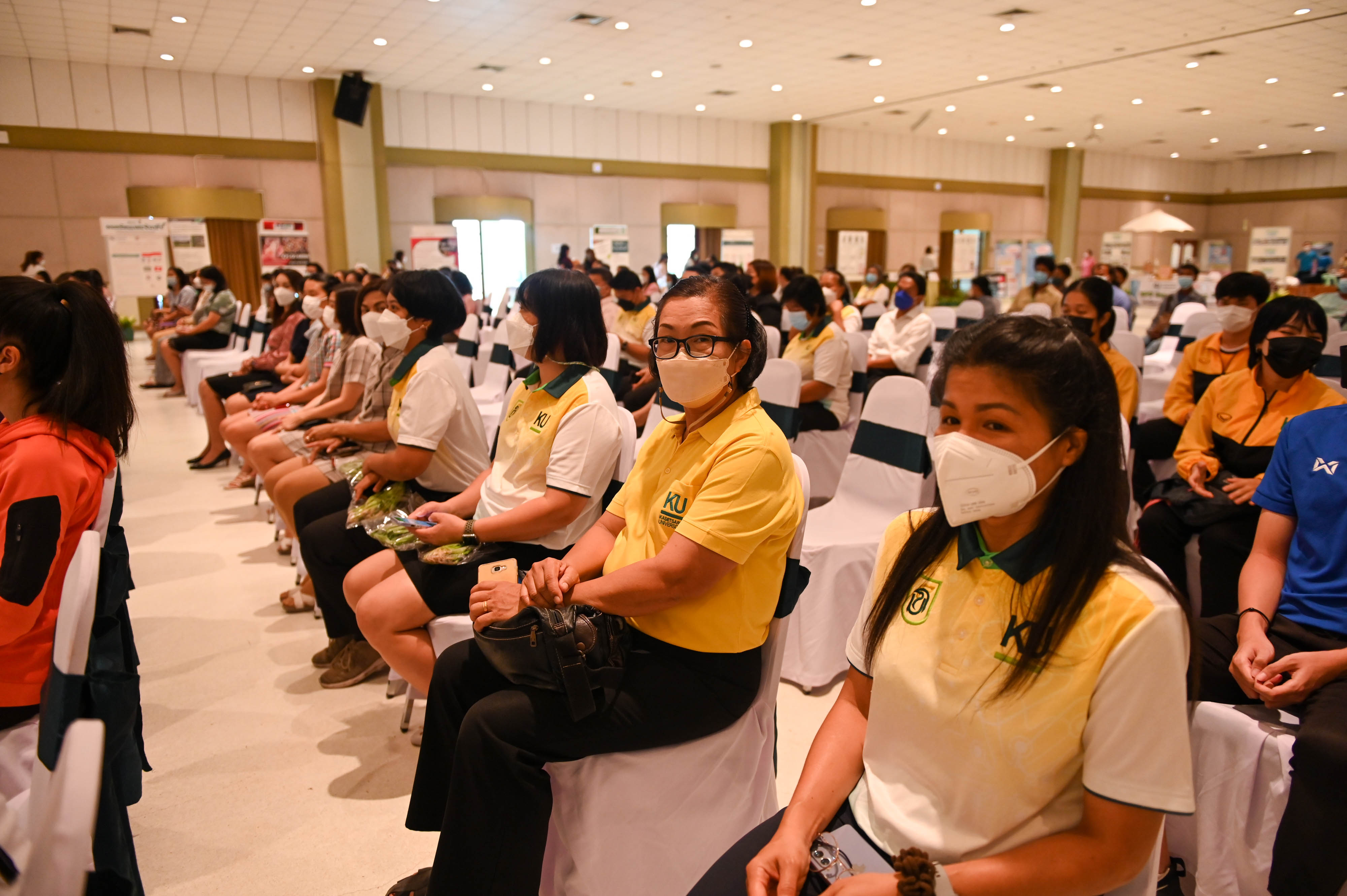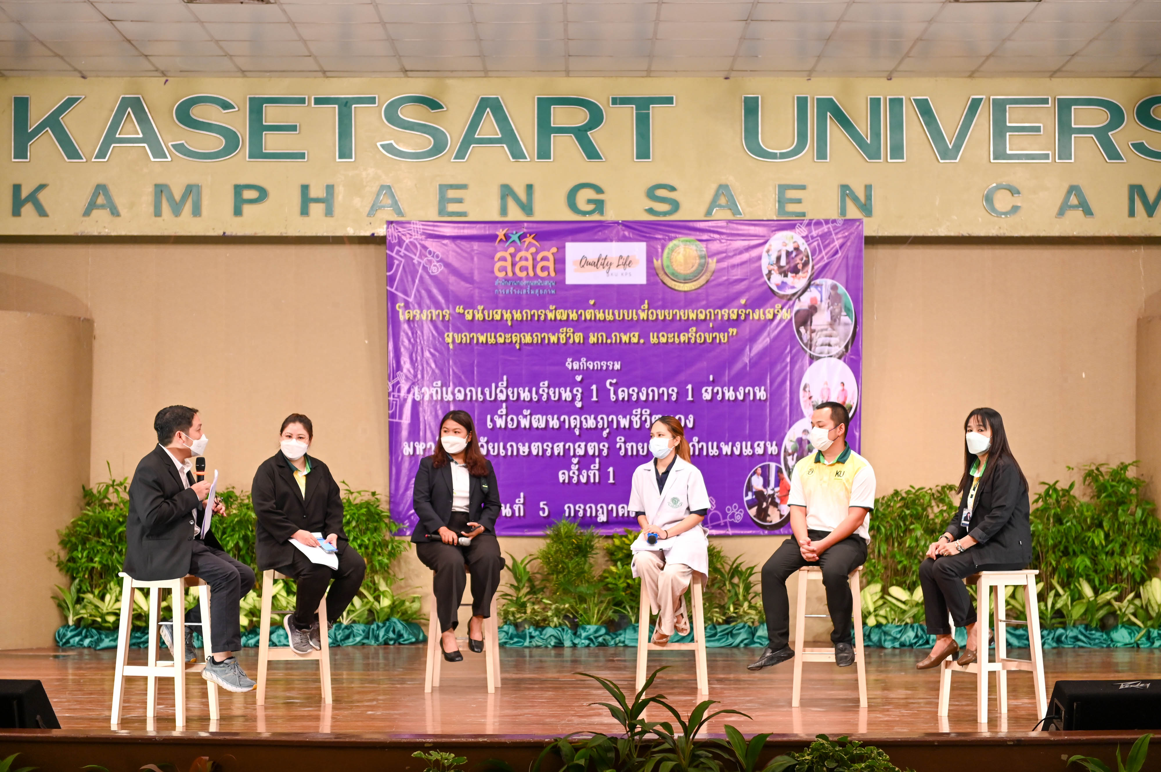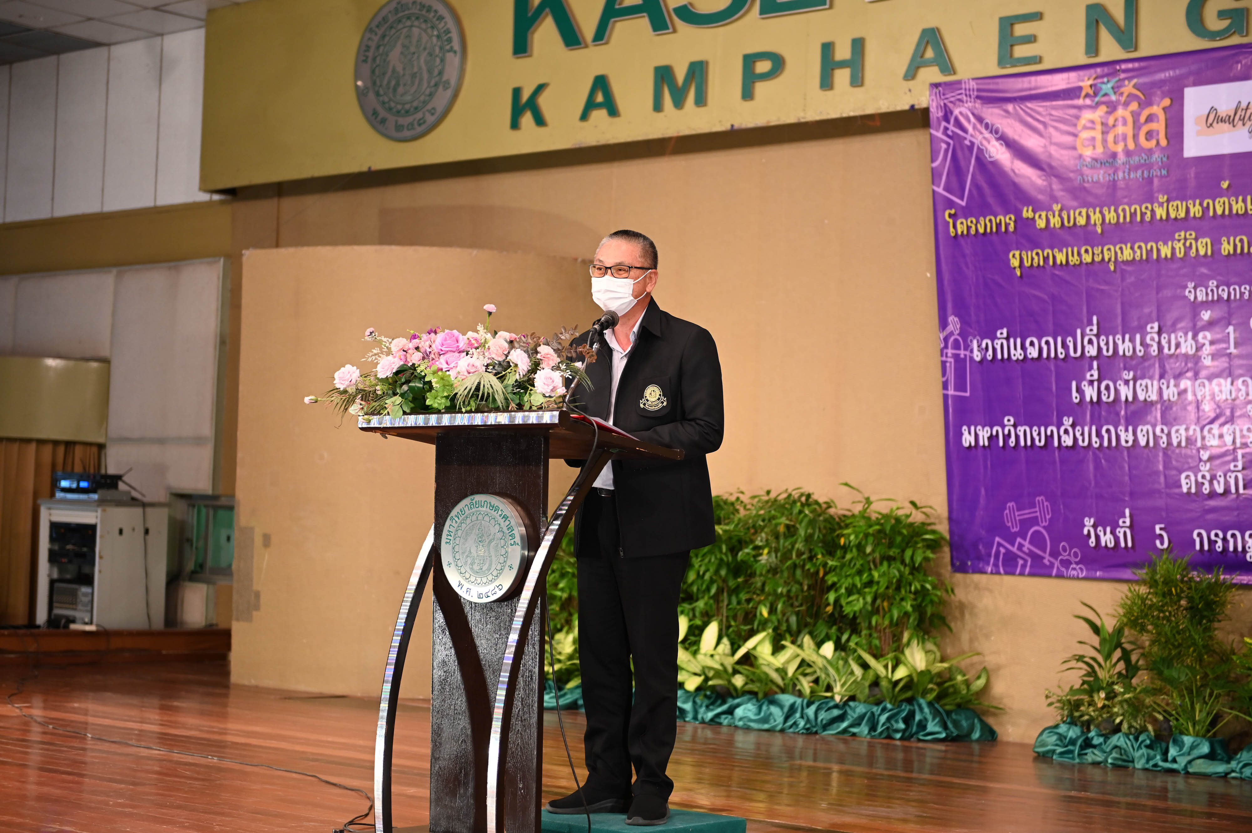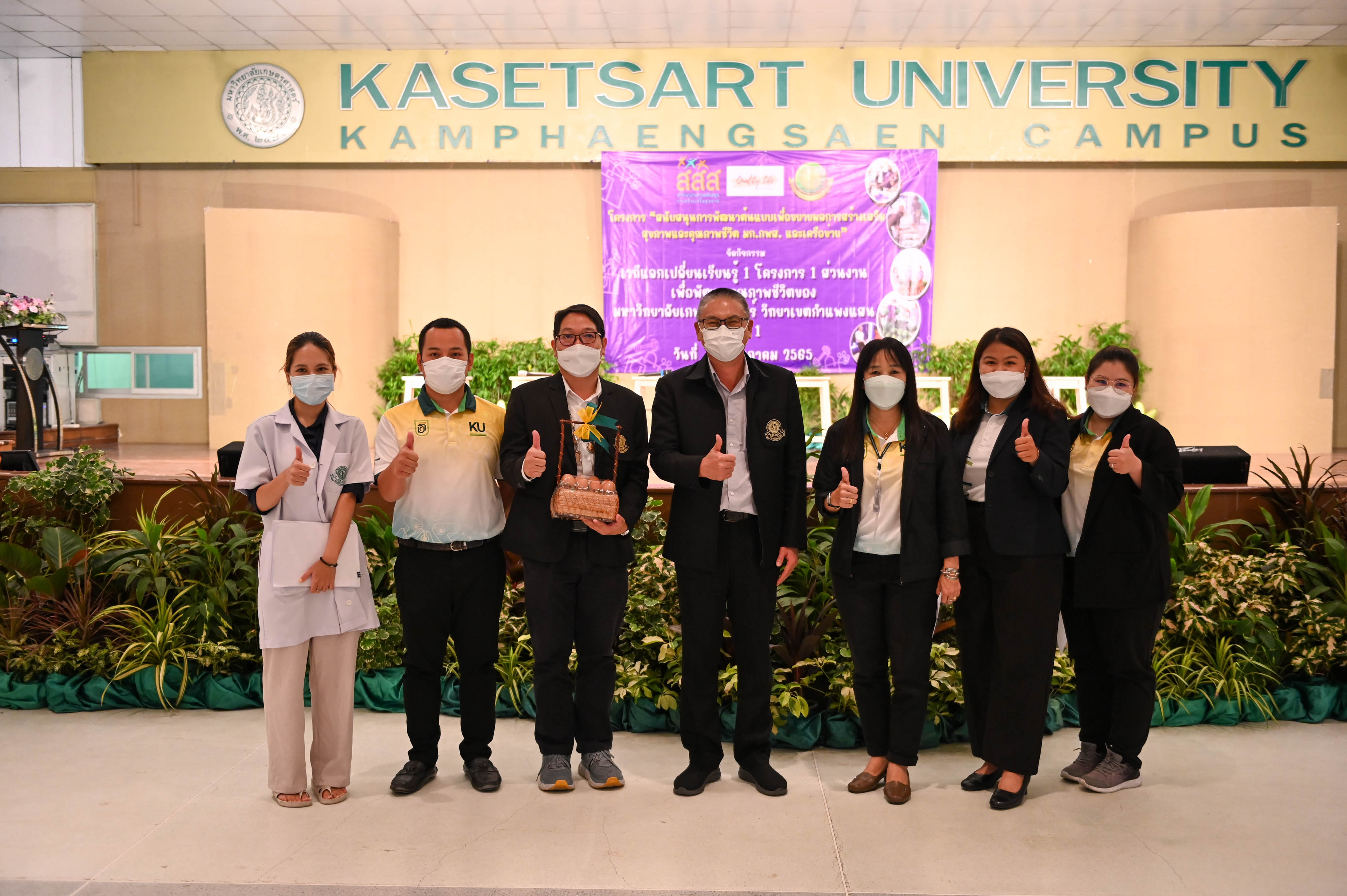วันอังคารที่ 5 กรกฎาคม 2565 เวลา 09.00 น. มหาวิทยาลัยเกษตรศาสตร์ วิทยาเขตกำแพงแสน ได้จัดโครงการสนับสนุนการพัฒนาต้นแบบเพื่อการขยายผลการสร้างเสริมสุขภาพและคุณภาพชีวิต กิจกรรมที่ 7 เวทีแลกเปลี่ยนเรียนรู้ 1 โครงการ 1 ส่วนงาน เพื่อพัฒนาคุณภาพชีวิตของมหาวิทยาลัยเกษตรศาสตร์ วิทยาเขตกำแพงแสน โดยมี รองศาสตราจารย์ นายสัตวแพทย์ ดร.อนุชัย ภิญโญภูมิมินทร์ รองอธิการบดีวิทยาเขตกำแพงแสน เป็นประธานเปิดโครงการ และมี ดร.กิตติพจน์ เพิ่มพูล ผู้ช่วยอธิการบดีฝ่ายบริการวิชาการและกิจการพิเศษ วิทยาเขตกำแพงแสน กล่าวรายงานวัตถุประสงค์เพื่อพัฒนาเป็นต้นแบบและขยายผลการสร้างเสริมสุขภาพ มุ่งยกระดับสุขภาพและคุณภาพชีวิตมุ่งเน้นและให้ความสำคัญด้านคุณภาพชีวิตของบุคลากรและนิสิต และเป้าหมายเป็นมหาวิทยาลัยแห่งความสุข ในปี 2570 ต่อไป ซึ่งในวันนี้ได้รับเกียรติจาก คุณฉัตรดนัย พลพืชน์ สำนักสนับสนุนสุขภาวะองค์กร (สำนัก 8) เป็นวิทยากรบรรยายพิเศษ ในหัวข้อ "ความสุขบุคลากรและนิสิต พื้นฐานของมหาวิทยาลัยแห่งความสุข" พร้อมทั้งมีการเสวนาเรื่อง "การถอดบทเรียนจากการจัดกิจกรรมเวทีแลกเปลี่ยนเรียนรู้ 1 โครงการ 1 ส่วนงาน เพื่อพัฒนาคุณภาพชีวิตของมหาวิทยาลัยเกษตรศาสตร์ วิทยาเขตกำแพงแสน ครั้งที่ 1" และกิจกรรมบูธนิทรรศการจากคณะต่างๆ การออกบูธร้านค้าเกษตรกรจากพื้นที่ใกล้เคียง และการประกวดการประกอบอาหารเพื่อสุขภาพในโครงการ Food for Life เป็นต้น ณ ห้องคอนเวนชั่น อาคารศูนย์มหาวิทยาลัย