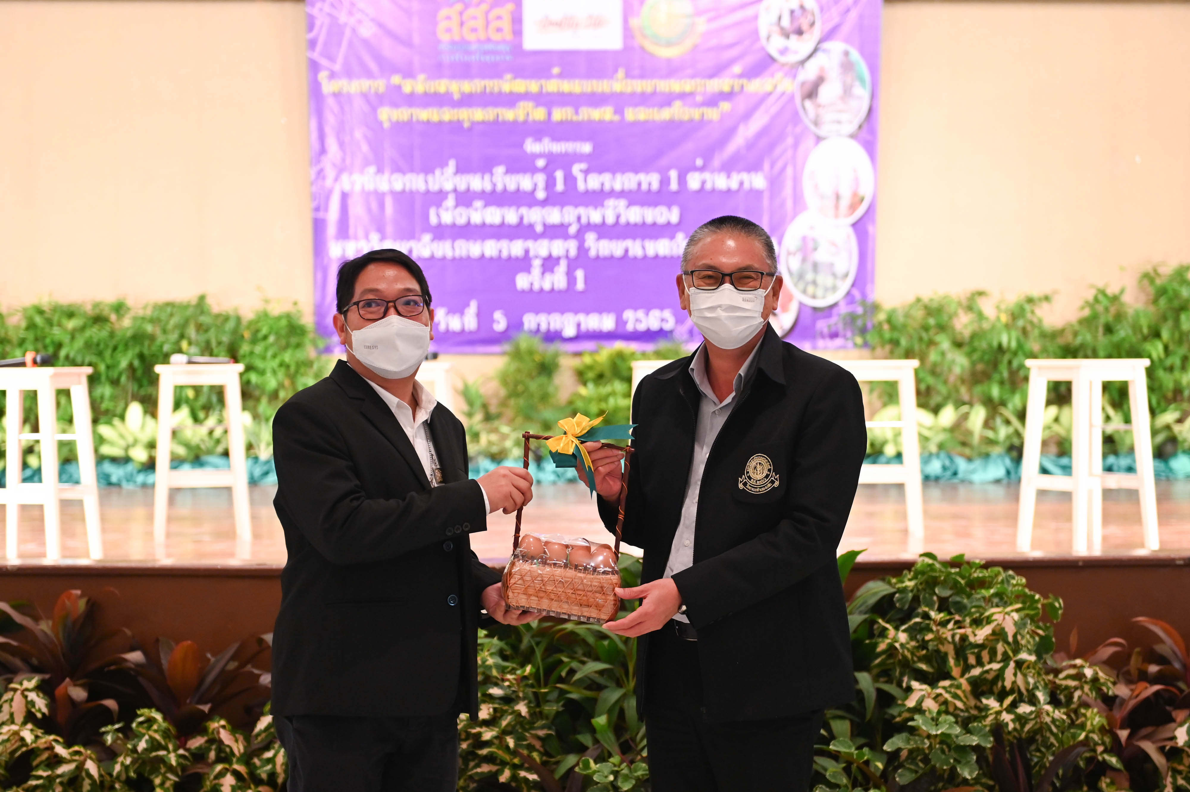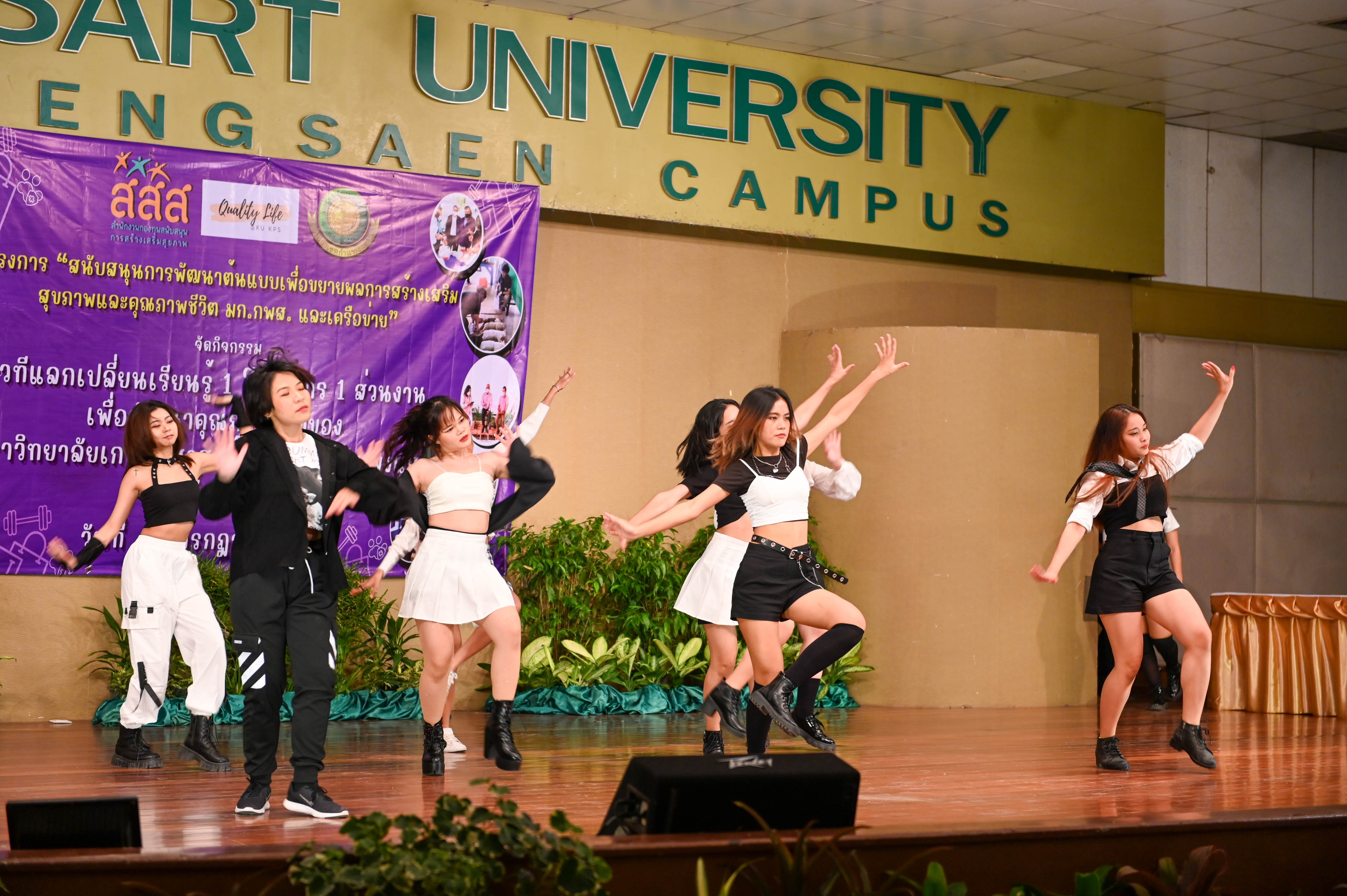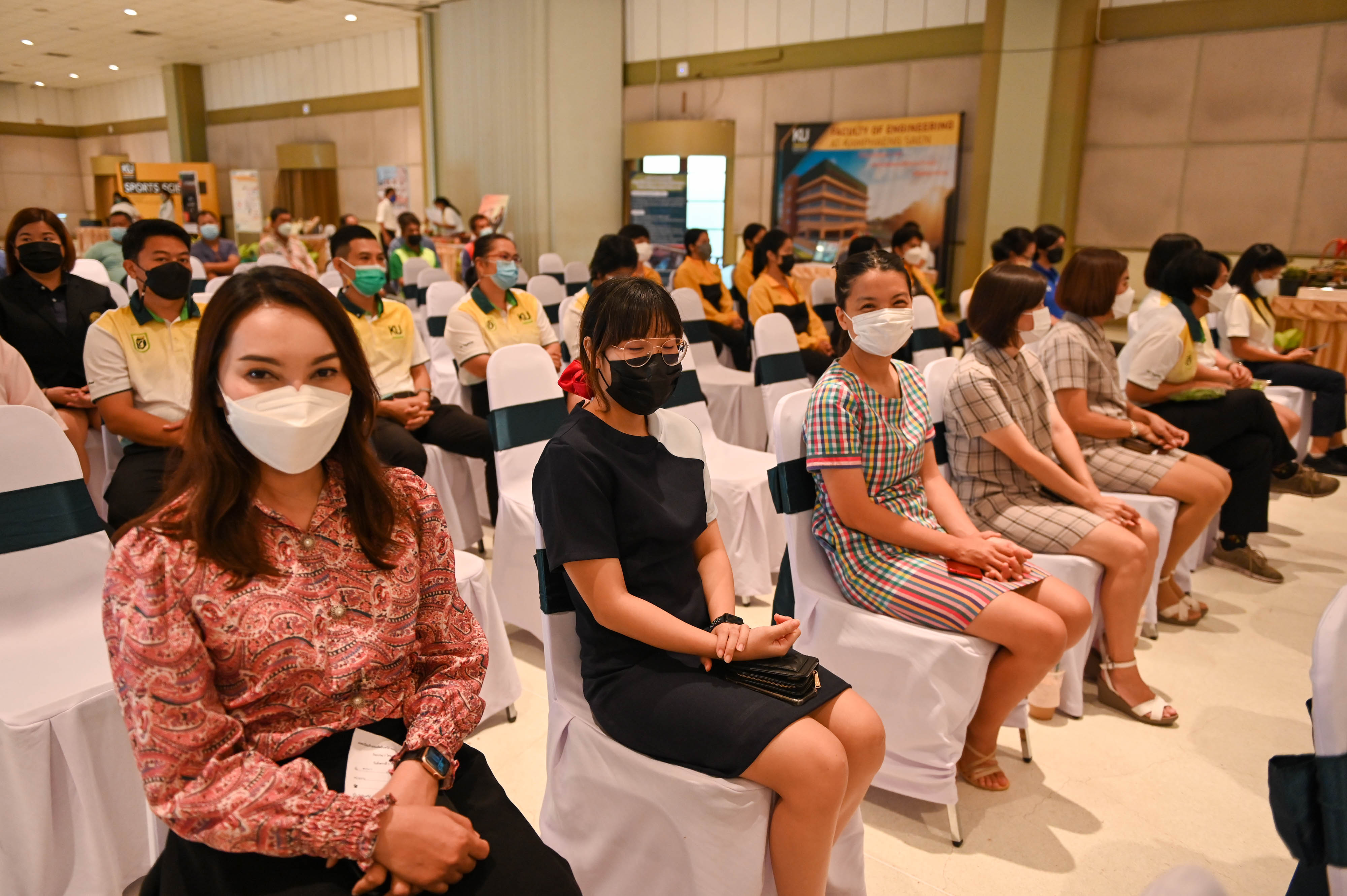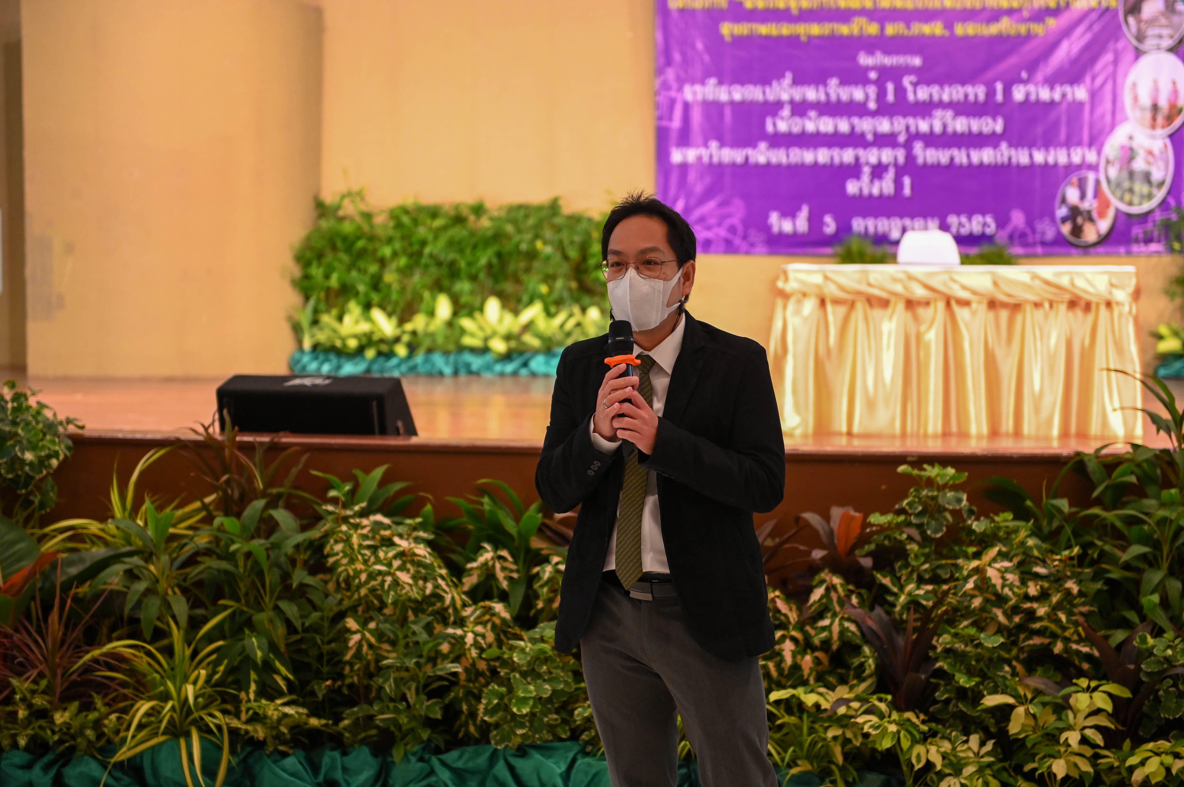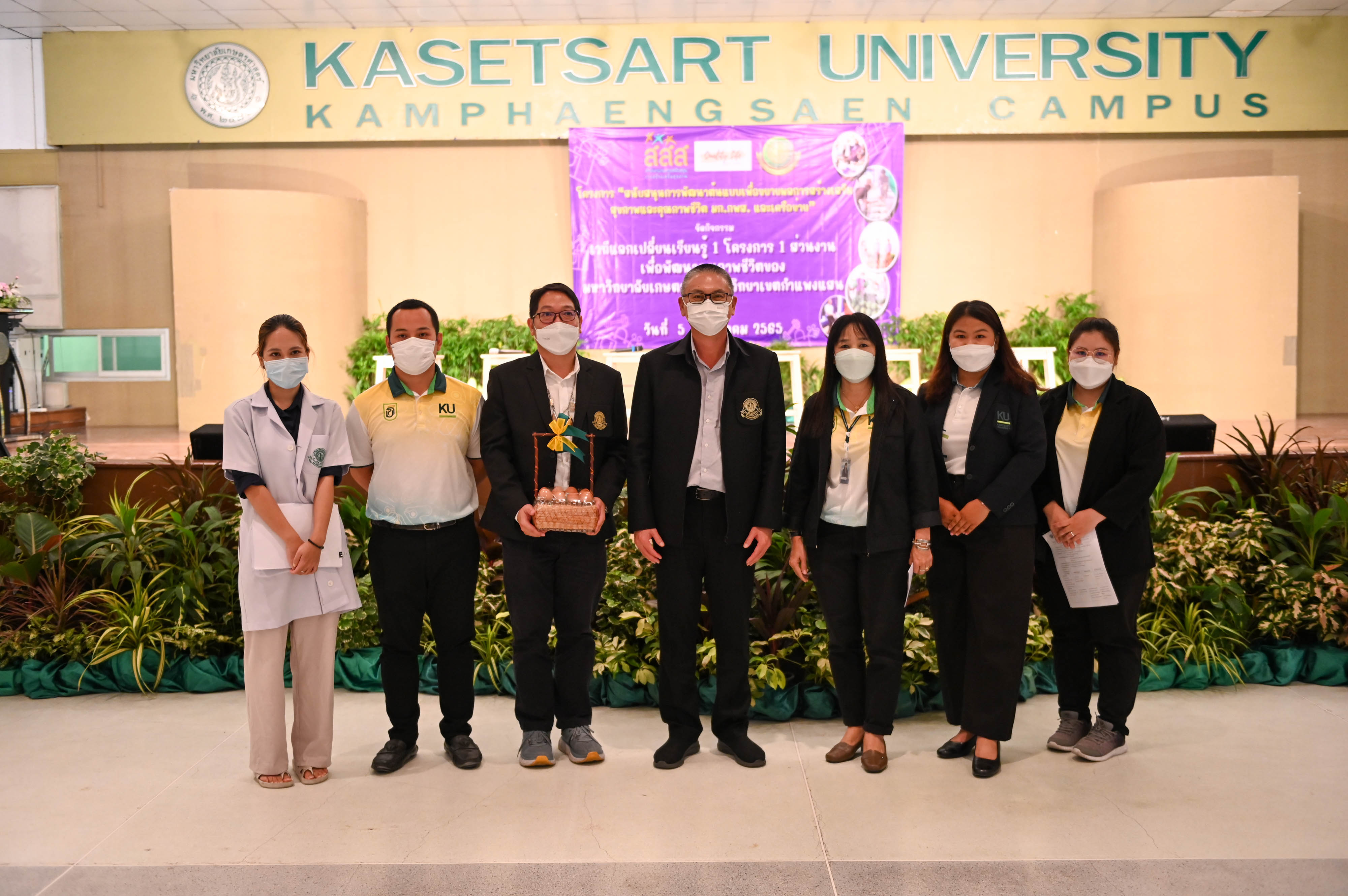 วันอังคารที่ 5 กรกฎาคม 2565 เวลา 09.00 น. มหาวิทยาลัยเกษตรศาสตร์ วิทยาเขตกำแพงแสน ได้จัดโครงการสนับสนุนการพัฒนาต้นแบบเพื่อการขยายผลการสร้างเสริมสุขภาพและคุณภาพชีวิต กิจกรรมที่ 7 เวทีแลกเปลี่ยนเรียนรู้ 1 โครงการ 1 ส่วนงาน เพื่อพัฒนาคุณภาพชีวิตของมหาวิทยาลัยเกษตรศาสตร์ วิทยาเขตกำแพงแสน โดยมี รองศาสตราจารย์ นายสัตวแพทย์ ดร.อนุชัย ภิญโญภูมิมินทร์ รองอธิการบดีวิทยาเขตกำแพงแสน เป็นประธานเปิดโครงการ และมี ดร.กิตติพจน์ เพิ่มพูล ผู้ช่วยอธิการบดีฝ่ายบริการวิชาการและกิจการพิเศษ วิทยาเขตกำแพงแสน กล่าวรายงานวัตถุประสงค์เพื่อพัฒนาเป็นต้นแบบและขยายผลการสร้างเสริมสุขภาพ มุ่งยกระดับสุขภาพและคุณภาพชีวิตมุ่งเน้นและให้ความสำคัญด้านคุณภาพชีวิตของบุคลากรและนิสิต และเป้าหมายเป็นมหาวิทยาลัยแห่งความสุข ในปี 2570 ต่อไป ซึ่งในวันนี้ได้รับเกียรติจาก คุณฉัตรดนัย พลพืชน์ สำนักสนับสนุนสุขภาวะองค์กร (สำนัก 8) เป็นวิทยากรบรรยายพิเศษ ในหัวข้อ "ความสุขบุคลากรและนิสิต พื้นฐานของมหาวิทยาลัยแห่งความสุข" พร้อมทั้งมีการเสวนาเรื่อง "การถอดบทเรียนจากการจัดกิจกรรมเวทีแลกเปลี่ยนเรียนรู้ 1 โครงการ 1 ส่วนงาน เพื่อพัฒนาคุณภาพชีวิตของมหาวิทยาลัยเกษตรศาสตร์ วิทยาเขตกำแพงแสน ครั้งที่ 1" และกิจกรรมบูธนิทรรศการจากคณะต่างๆ การออกบูธร้านค้าเกษตรกรจากพื้นที่ใกล้เคียง และการประกวดการประกอบอาหารเพื่อสุขภาพในโครงการ Food for Life เป็นต้น ณ ห้องคอนเวนชั่น อาคารศูนย์มหาวิทยาลัย