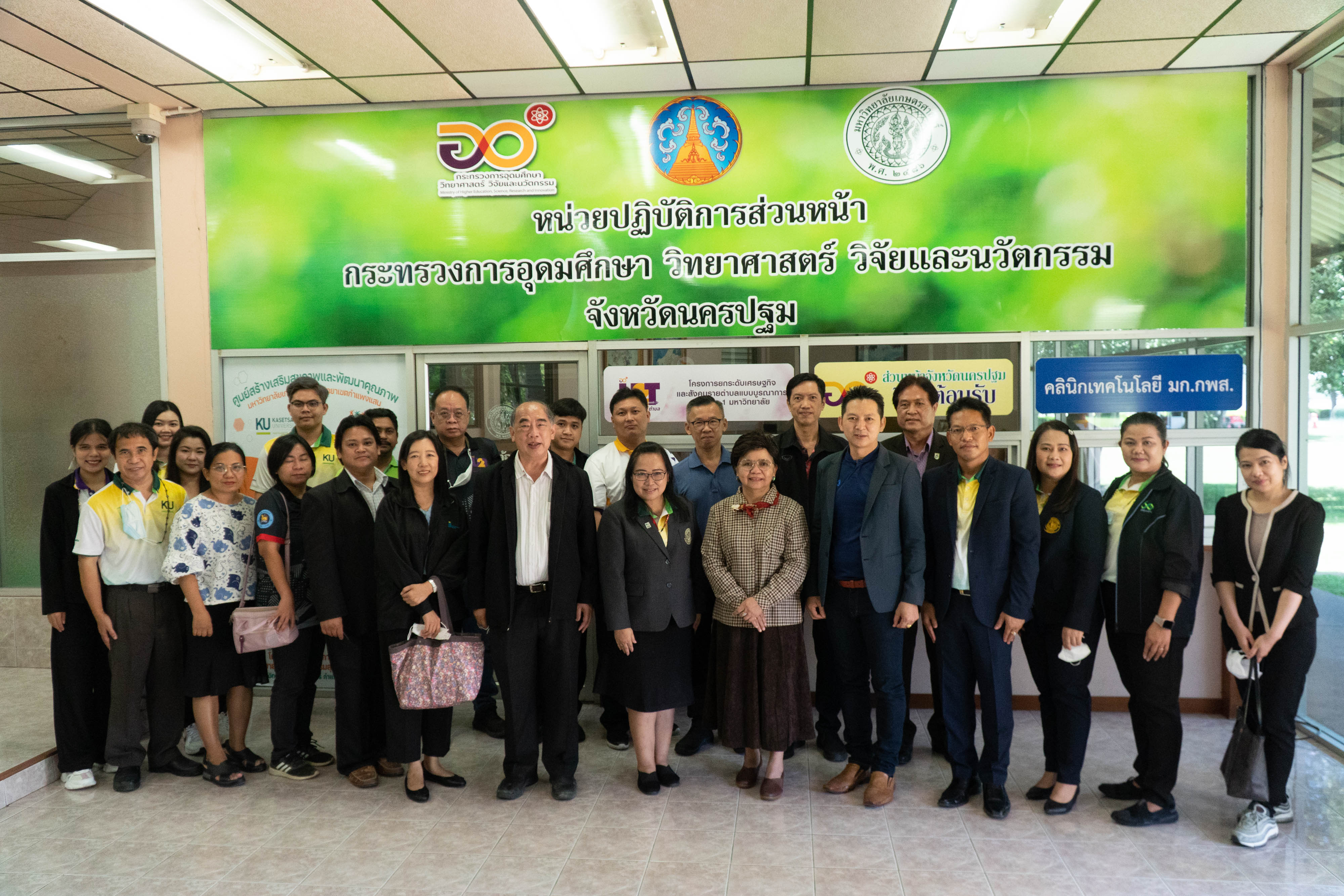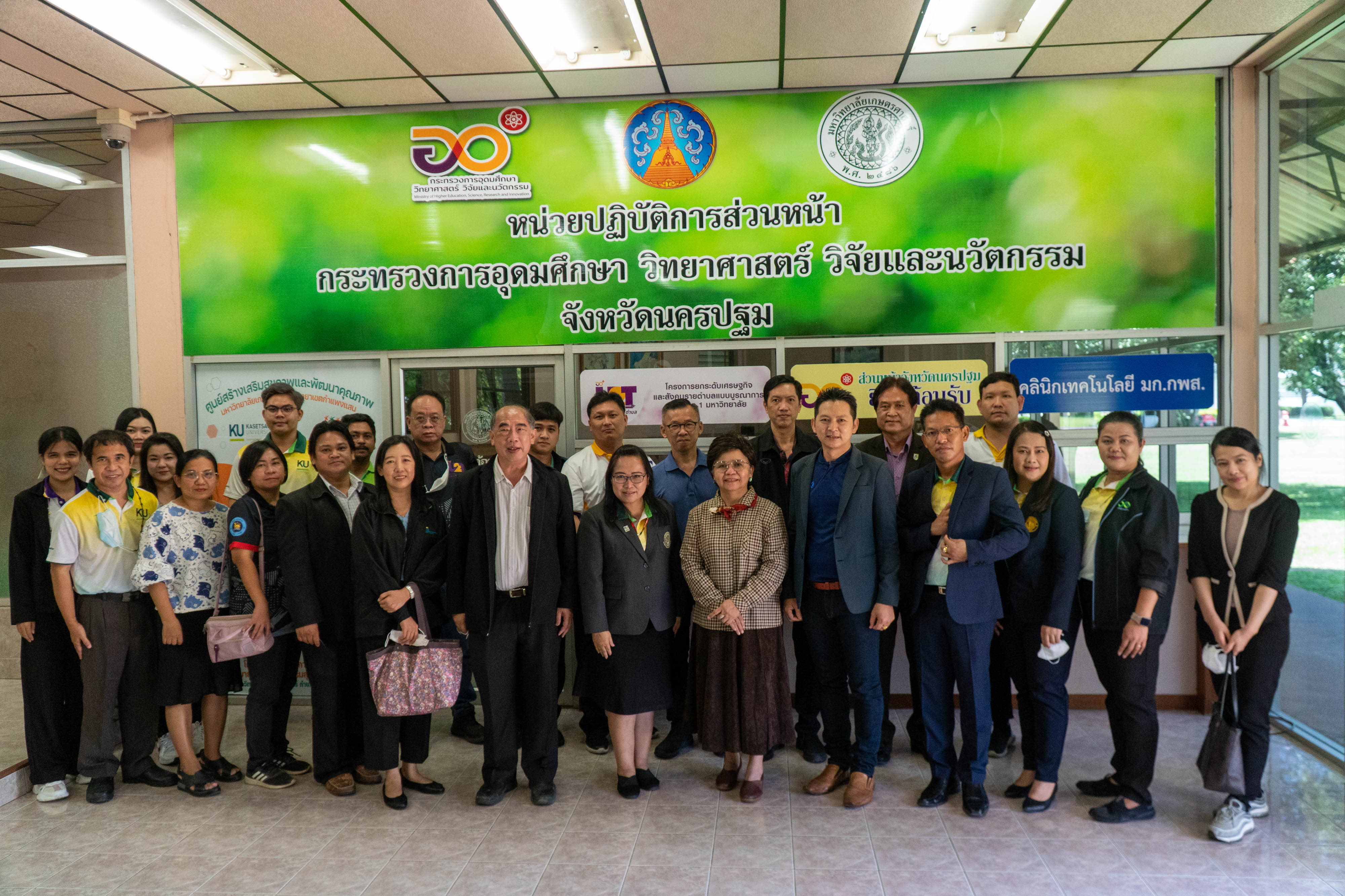เมื่อวันอาทิตย์ที่ 4 กันยายน 2565 มหาวิทยาลัยเกษตรศาสตร์ วิทยาเขตกำแพงแสน นำโดย ผู้ช่วยศาสตราจารย์ ดร.สุกัญญา รัตนทับทิมทอง ผู้ช่วยอธิการบดีฝ่ายวิจัย นวัตกรรม และวิเทศสัมพันธ์ วิทยาเขตกำแพงแสน และคณะทำงาน (อว.ส่วนหน้า จังหวัดนครปฐม) ร่วมต้อนรับคณะกรรมการบริหารโครงการยกระดับเศรษฐกิจและสังคมรายตำบลแบบบูรณาการ (มหาวิทยาลัยสู่ตำบล สร้างรากแก้วให้ประเทศ) หลังสถานการณ์โควิดด้วยเศรษฐกิจ BCG ลงพื้นที่ตรวจเยี่ยมในพื้นที่จังหวัดนครปฐม ซึ่งนำโดย นางสุวรรณี คำมั่น (ที่ปรึกษารัฐมนตรีว่าการกระทรวงอุดมศึกษา วิทยาศาสตร์ วิจัย และนวัตกรรม) สำนักงานปลัดกระทรวงการอุดมศึกษา วิทยาศาสตร์ วิจัย และนวัตกรรม กรมวิทยาศาสตร์บริการ และคณะ โดยมีหน่วยงานคณะทำงานสนับสนุนพัฒนาจังหวัดเพื่อขับเคลื่อนไทยไปด้วยกันประจำจังหวัดนครปฐม (อว.ส่วนหน้า จังหวัดนครปฐม) เข้าร่วมดังนี้ มหาวิทยาลัยราชภัฏนครปฐม มหาวิทยาลัยเทคโนโลยีราชมงคลกรุงเทพ มหาวิทยาลัยราชมงคลรัตนโกสินทร์ และได้มีการลงพื้นที่ตรวจเยี่ยม 3 ตำบล ได้แก่ ตำบลบ้านหลวง ตำบลดอนรวก อำเภอดอนตูม ตำบลโพรงมะเดื่อ อำเภอเมือง จังหวัดนครปฐม เป็นต้น