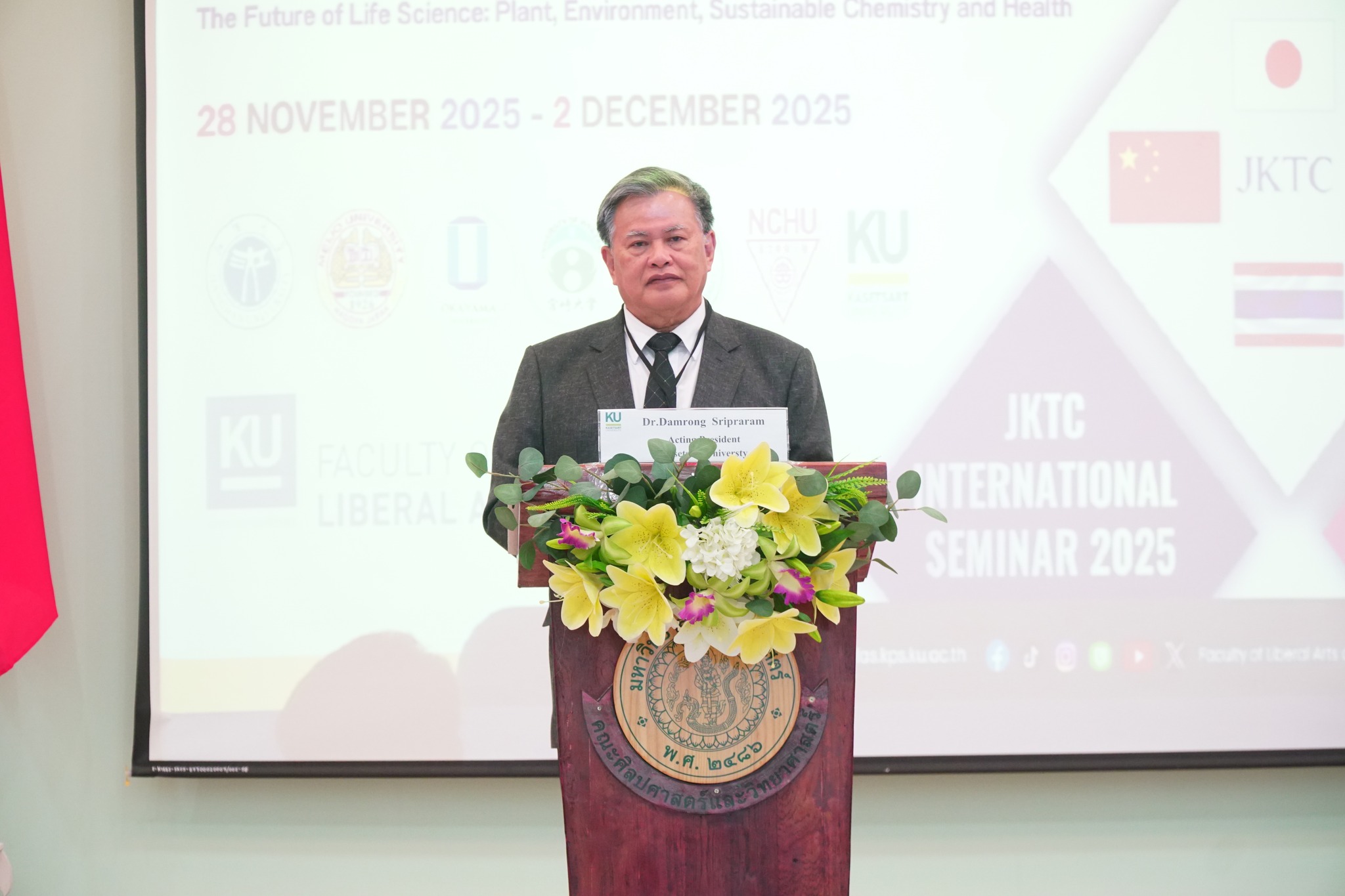 ดร.ดำรงค์ ศรีพระราม รักษาการแทนอธิการบดีมหาวิทยาลัยเกษตรศาสตร์ เป็นประธานเปิดงานประชุมวิชาการระดับนานาชาติ (JKTC International Seminar 2025) The Future of life Science: Plant, Environment, Sustainable Chemistry and Health