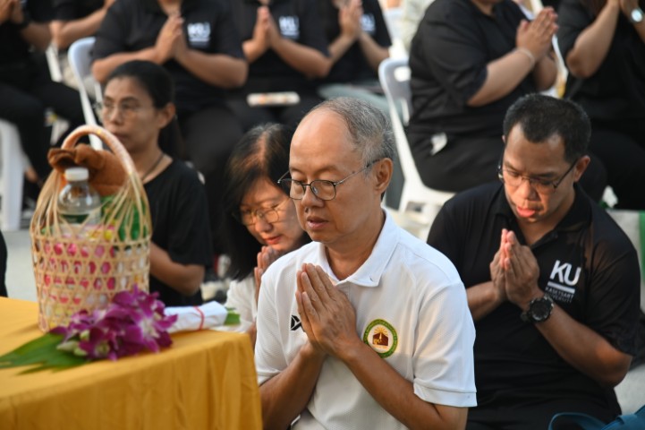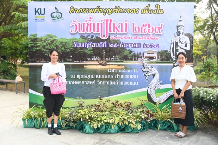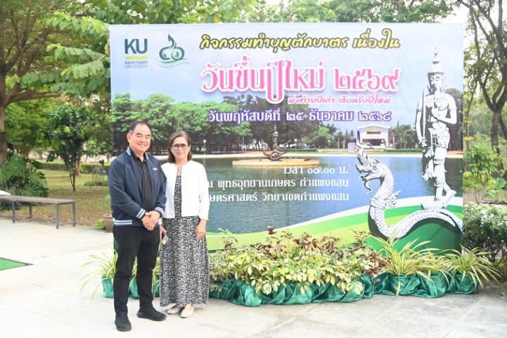 มหาวิทยาลัยเกษตรศาสตร์ วิทยาเขตกำแพงแสน จัดกิจกรรมทำบุญตักบาตรเนื่องในวันขึ้นปีใหม่ 2569 (ส่งท้ายปีเก่า ต้อนรับปีใหม่ 2569) เมื่อวันพฤหัสบดีที่ 25 ธันวาคม 2568 ณ พุทธอุทยานเกษตร กำแพงแสน โดย รองศาสตราจารย์ นายสัตวแพทย์ ดร.อนุชัย ภิญโญภูมิมินทร์ รองอธิการบดี วิทยาเขตกำแพงแสน เป็นประธานจุดธูปเทียนบูชาพระรัตนตรัย และร่วมใส่บาตรพระสงฆ์จากวัดคลองตัน ตำบลวังน้ำเขียว และวัดป่าศรัทธาธรรม ตำบลทุ่งขวาง อำเภอกำแพงแสน จังหวัดนครปฐม เนื่องในวันขึ้นปีใหม่ 2569 จากนั้นร่วมรับพรปีใหม่ ฟังโอวาทและรับน้ำพระพุทธมนต์เพื่อเป็นสิริมงคล จากพระอธิการเตโช เตชินฺโท เจ้าอาวาสวัดคลองตัน ซึ่งมี คณะผู้บริหาร คณาจารย์ บุคลากร และนิสิตของมหาวิทยาลัยเกษตรศาสตร์ วิทยาเขตกำแพงแสน เข้าร่วมกิจกรรมในครั้งนี้เป็นจำนวนมาก
