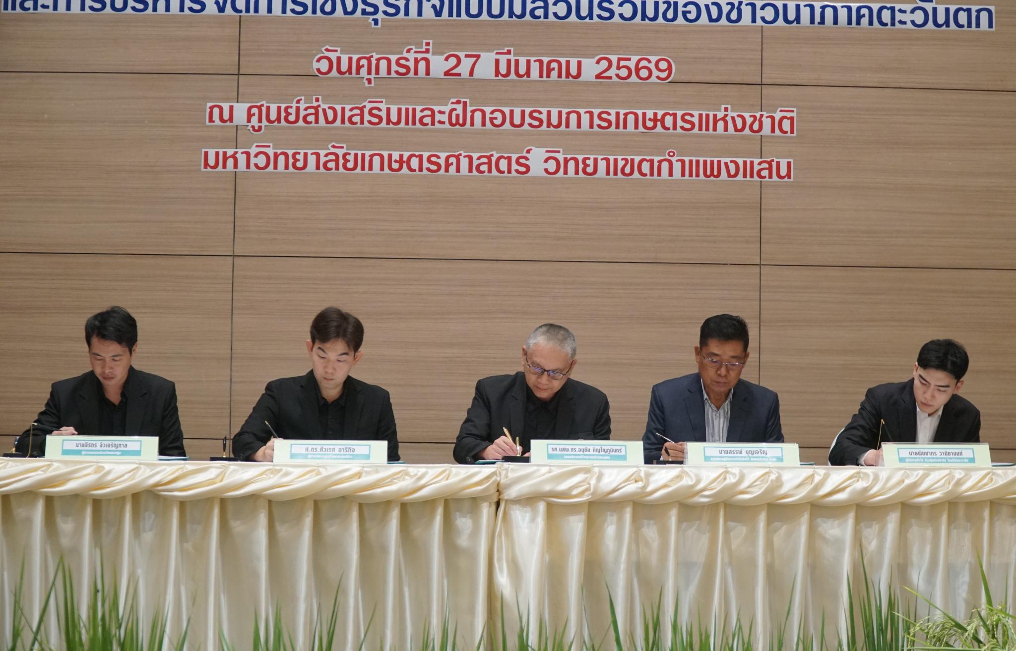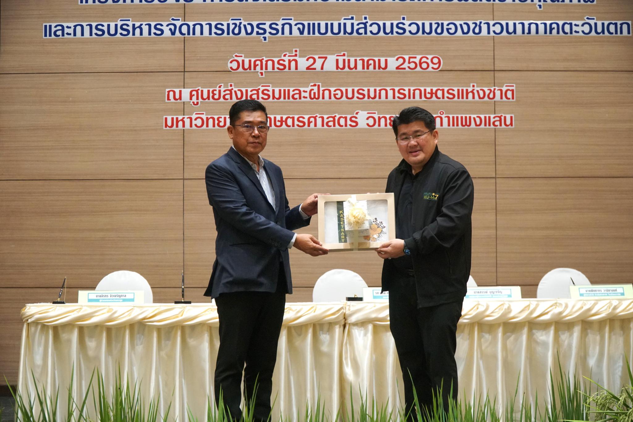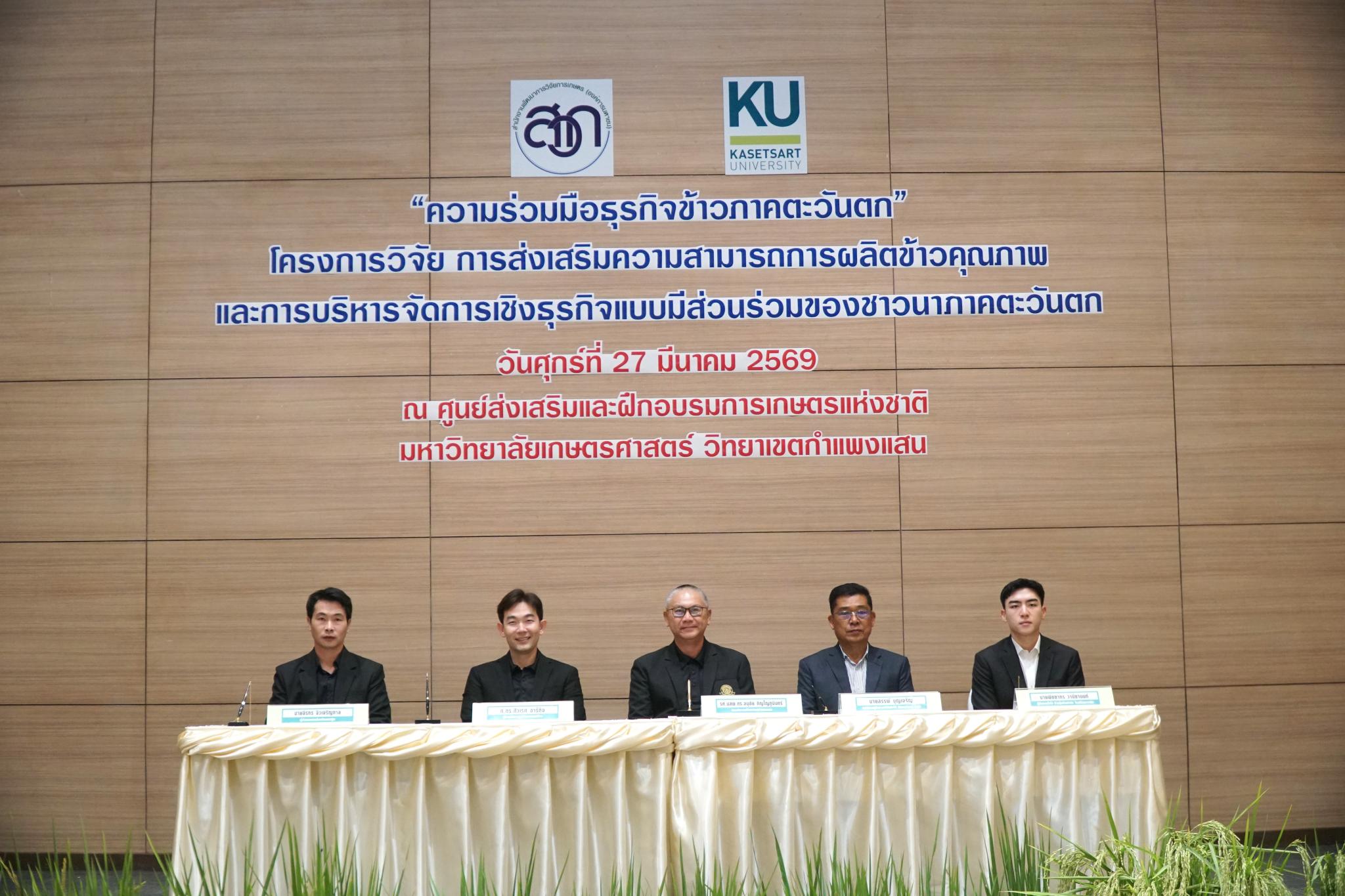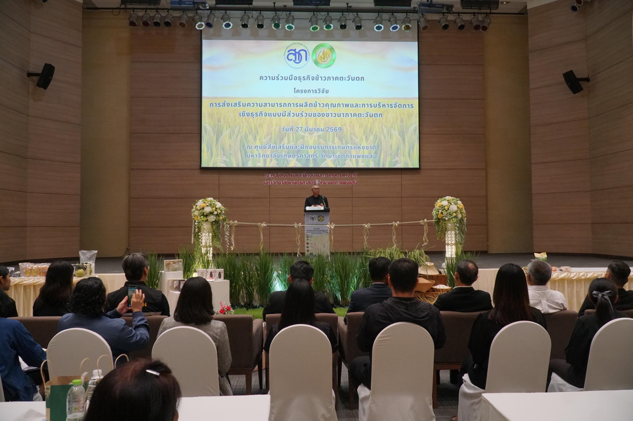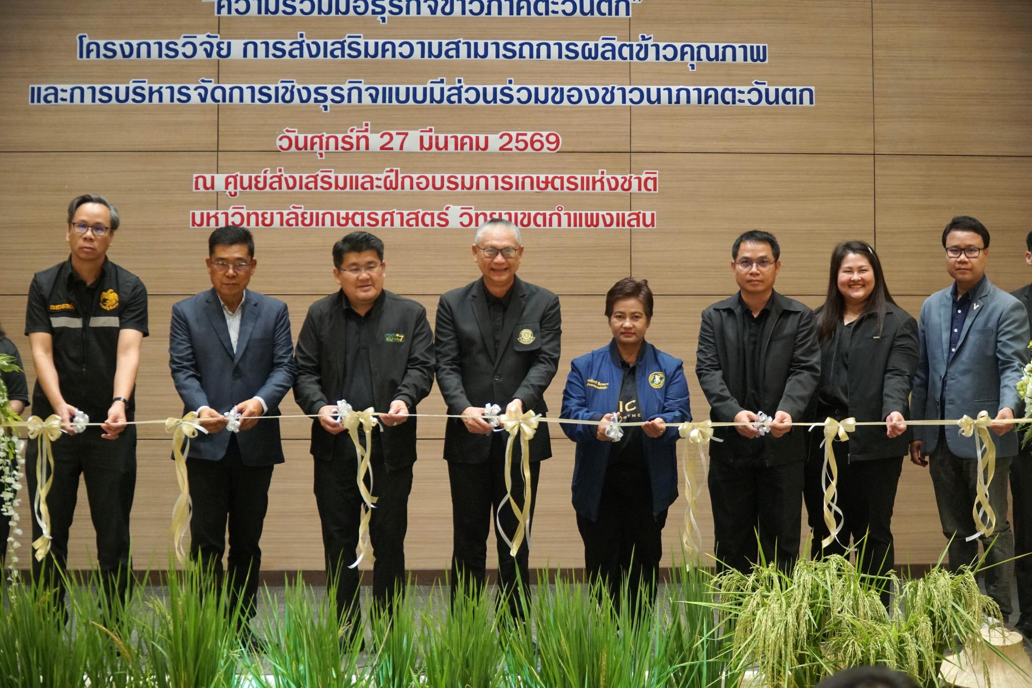 มหาวิทยาลัยเกษตรศาสตร์ วิทยาเขตกำแพงแสน โดย รองศาสตราจารย์ นายสัตวแพทย์ ดร.อนุชัย ภิญโญภูมินทร์ รองอธิการบดีวิทยาเขตกำแพงแสน เป็นประธานในพิธีเปิด กิจกรรมความร่วมมือธุรกิจข้าวภาคตะวันตก ภายใต้โครงการวิจัย “การส่งเสริมความสามารถการผลิตข้าวคุณภาพและการบริหารจัดการเชิงธุรกิจแบบมีส่วนร่วมของชาวนาภาคตะวันตก” ทุนอุดหนุน สกว. เมื่อวันศุกร์ที่ 27 มีนาคม 2569 ณ แสนปาล์มคอนเวนชั่น ฮอลล์ ศูนย์ส่งเสริมและฝึกอบรมการเกษตรแห่งชาติ มหาวิทยาลัยเกษตรศาสตร์ วิทยาเขตกำแพงแสน จังหวัดนครปฐม โดยมี รองศาสตราจารย์ ดร.ธานินทร์ คงศิลา รองอธิการบดีฝ่ายทรัพยากรมนุษย์และยุทธศาสตร์ รักษาการแทนผู้อำนวยการสำนักส่งเสริมและฝึกอบรม กำแพงแสน กล่าวต้อนรับ และ ดร.สาคร ชินวงค์ หัวหน้าโครงการ กล่าวรายงาน