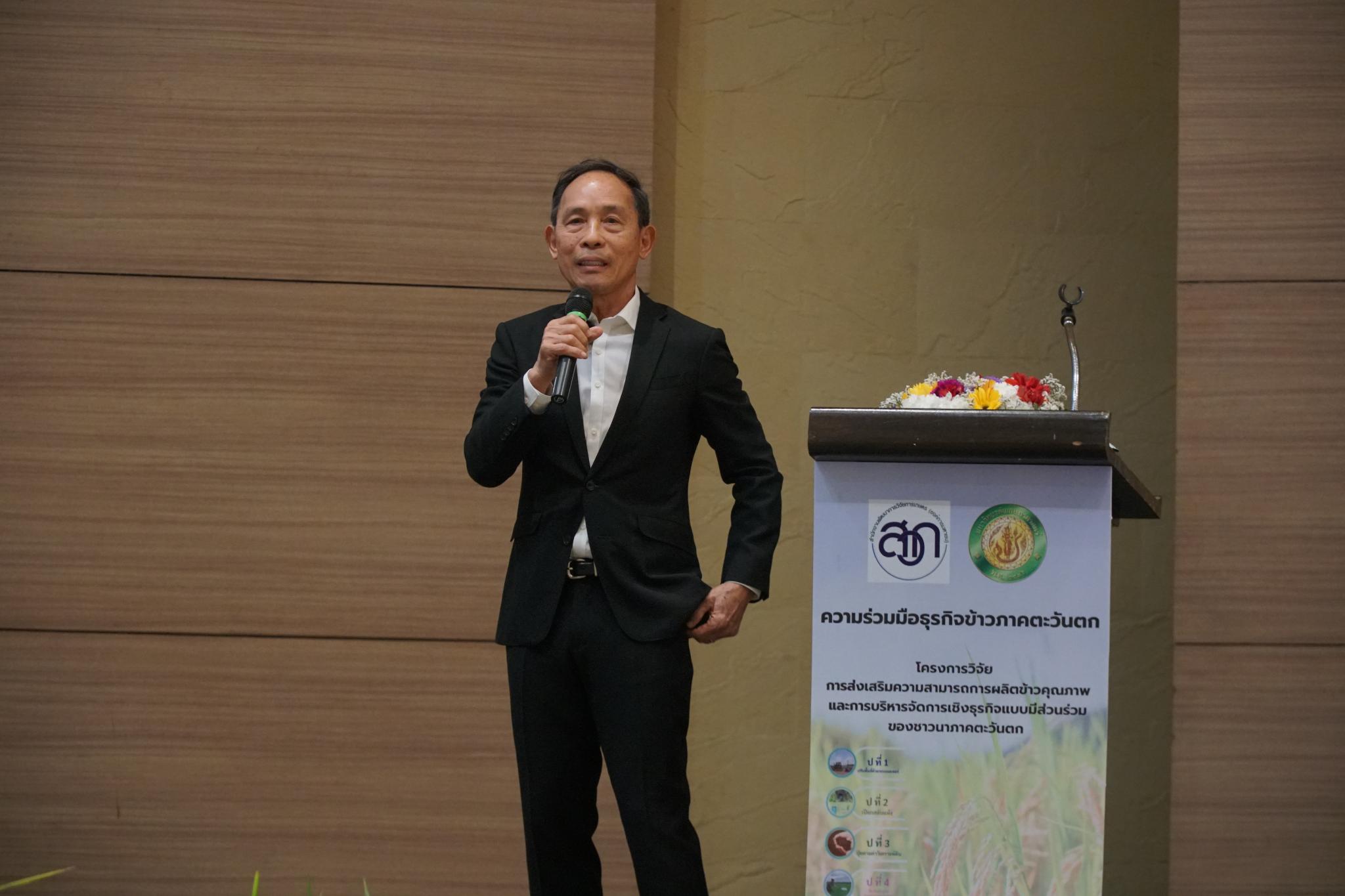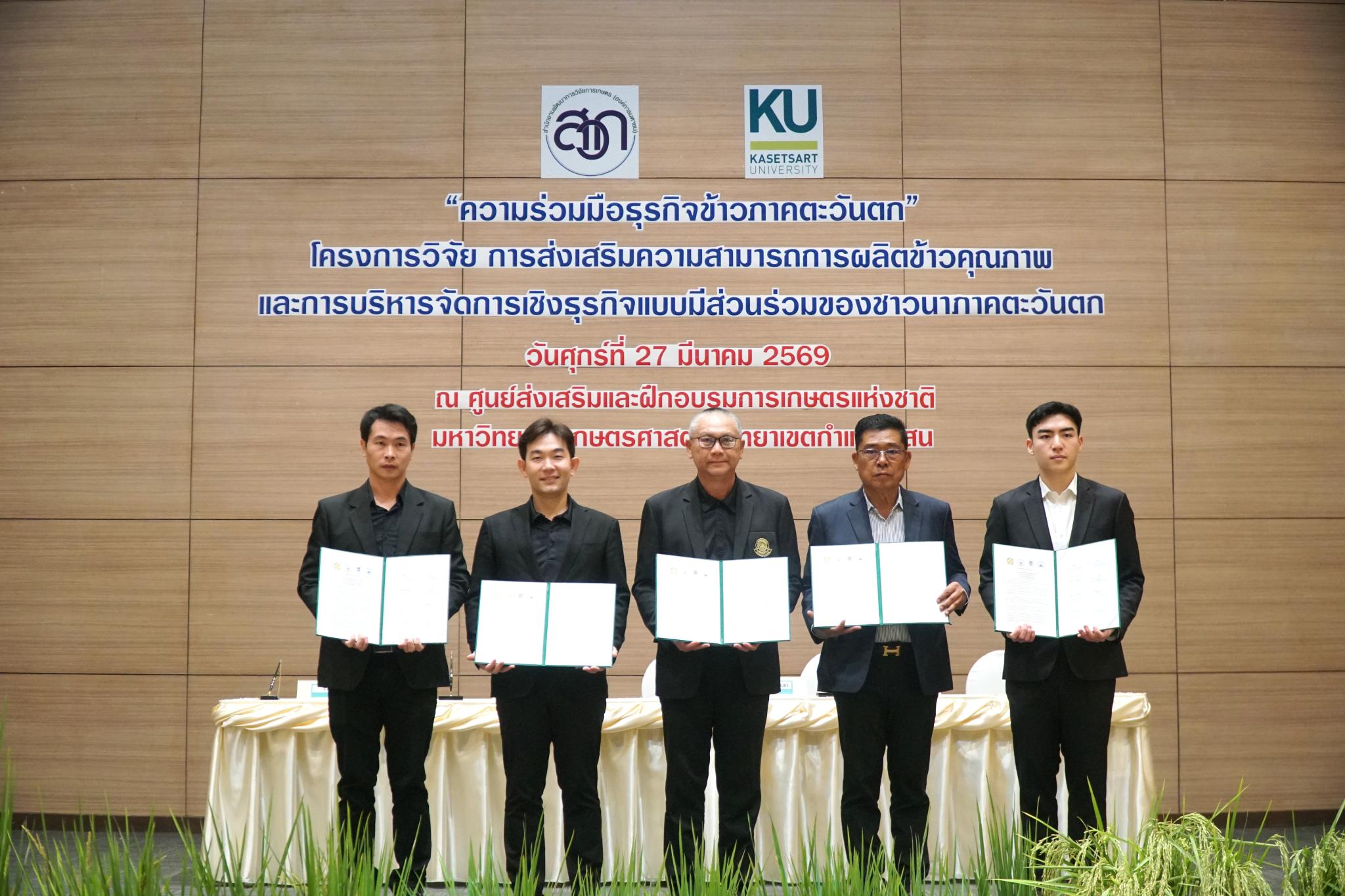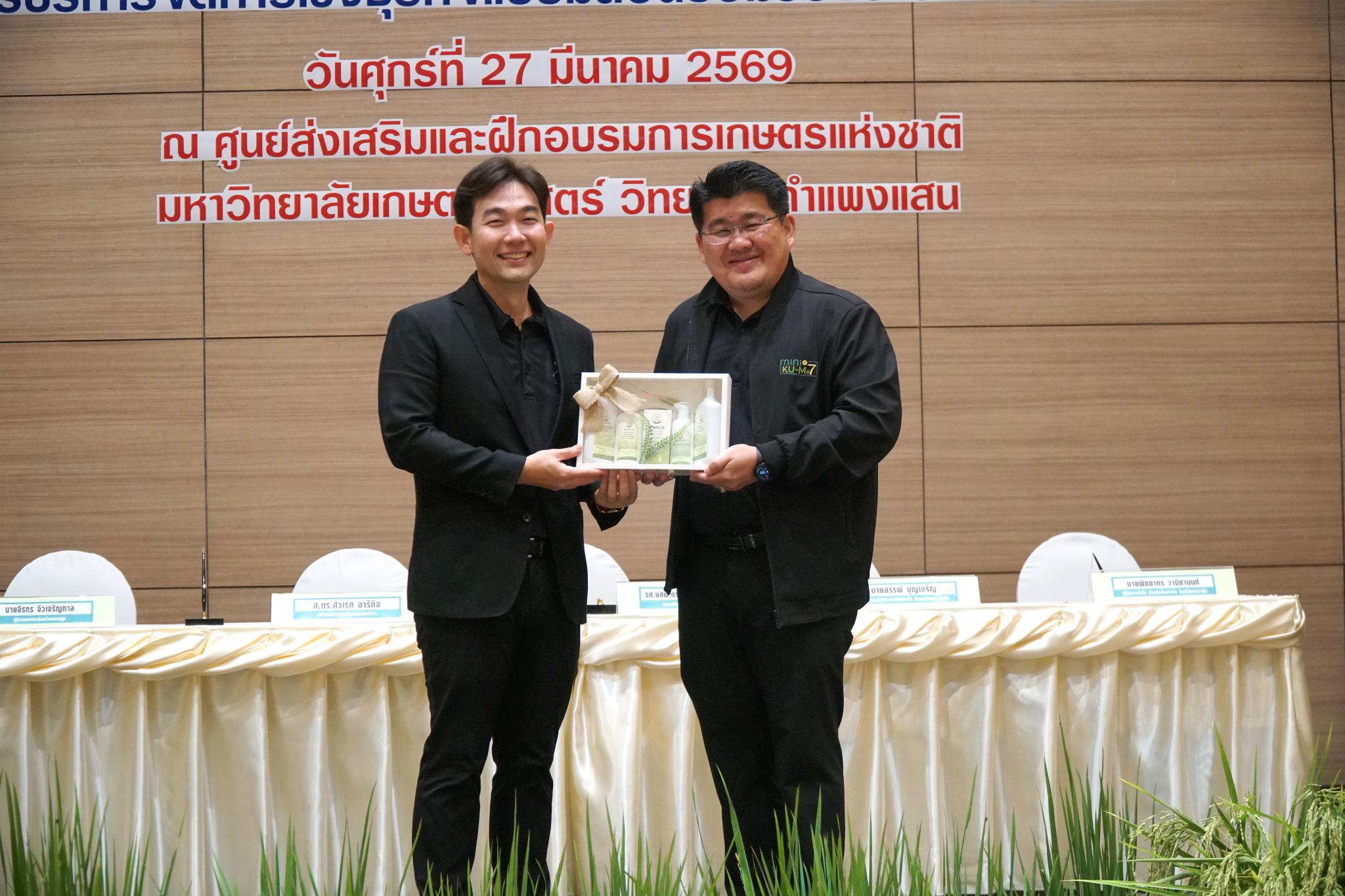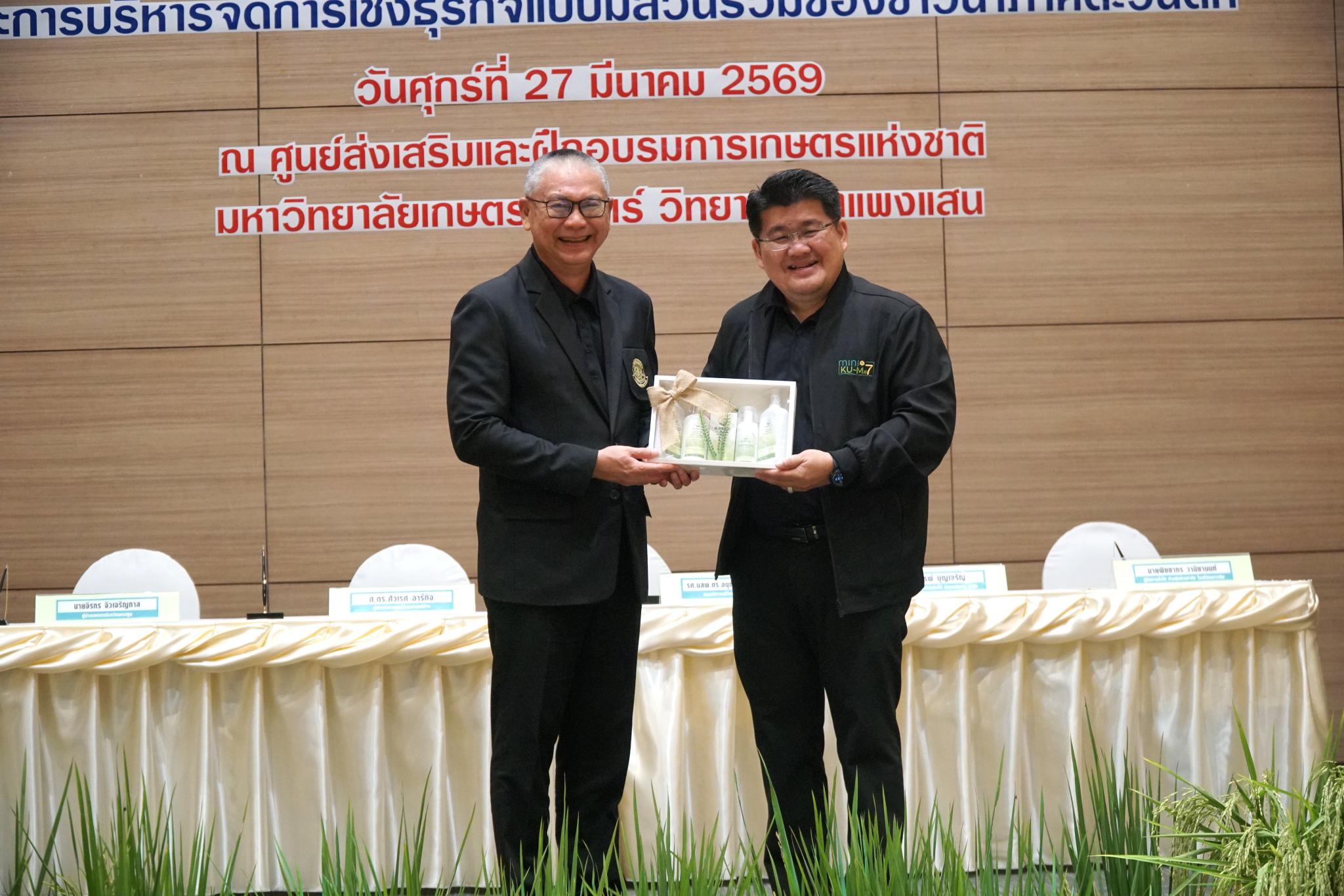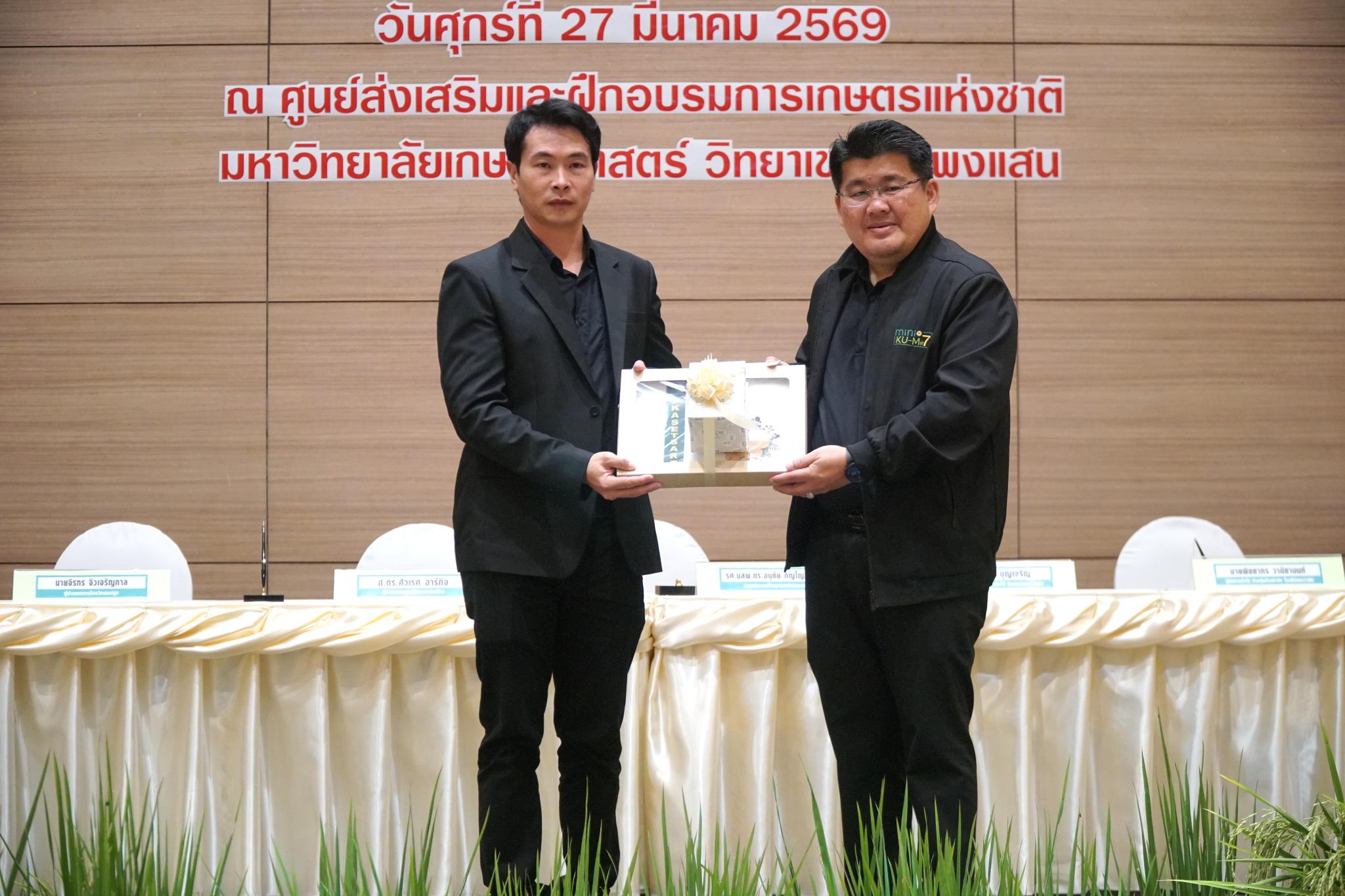 มหาวิทยาลัยเกษตรศาสตร์ วิทยาเขตกำแพงแสน โดย รองศาสตราจารย์ นายสัตวแพทย์ ดร.อนุชัย ภิญโญภูมินทร์ รองอธิการบดีวิทยาเขตกำแพงแสน เป็นประธานในพิธีเปิด กิจกรรมความร่วมมือธุรกิจข้าวภาคตะวันตก ภายใต้โครงการวิจัย “การส่งเสริมความสามารถการผลิตข้าวคุณภาพและการบริหารจัดการเชิงธุรกิจแบบมีส่วนร่วมของชาวนาภาคตะวันตก” ทุนอุดหนุน สกว. เมื่อวันศุกร์ที่ 27 มีนาคม 2569 ณ แสนปาล์มคอนเวนชั่น ฮอลล์ ศูนย์ส่งเสริมและฝึกอบรมการเกษตรแห่งชาติ มหาวิทยาลัยเกษตรศาสตร์ วิทยาเขตกำแพงแสน จังหวัดนครปฐม โดยมี รองศาสตราจารย์ ดร.ธานินทร์ คงศิลา รองอธิการบดีฝ่ายทรัพยากรมนุษย์และยุทธศาสตร์ รักษาการแทนผู้อำนวยการสำนักส่งเสริมและฝึกอบรม กำแพงแสน กล่าวต้อนรับ และ ดร.สาคร ชินวงค์ หัวหน้าโครงการ กล่าวรายงาน
